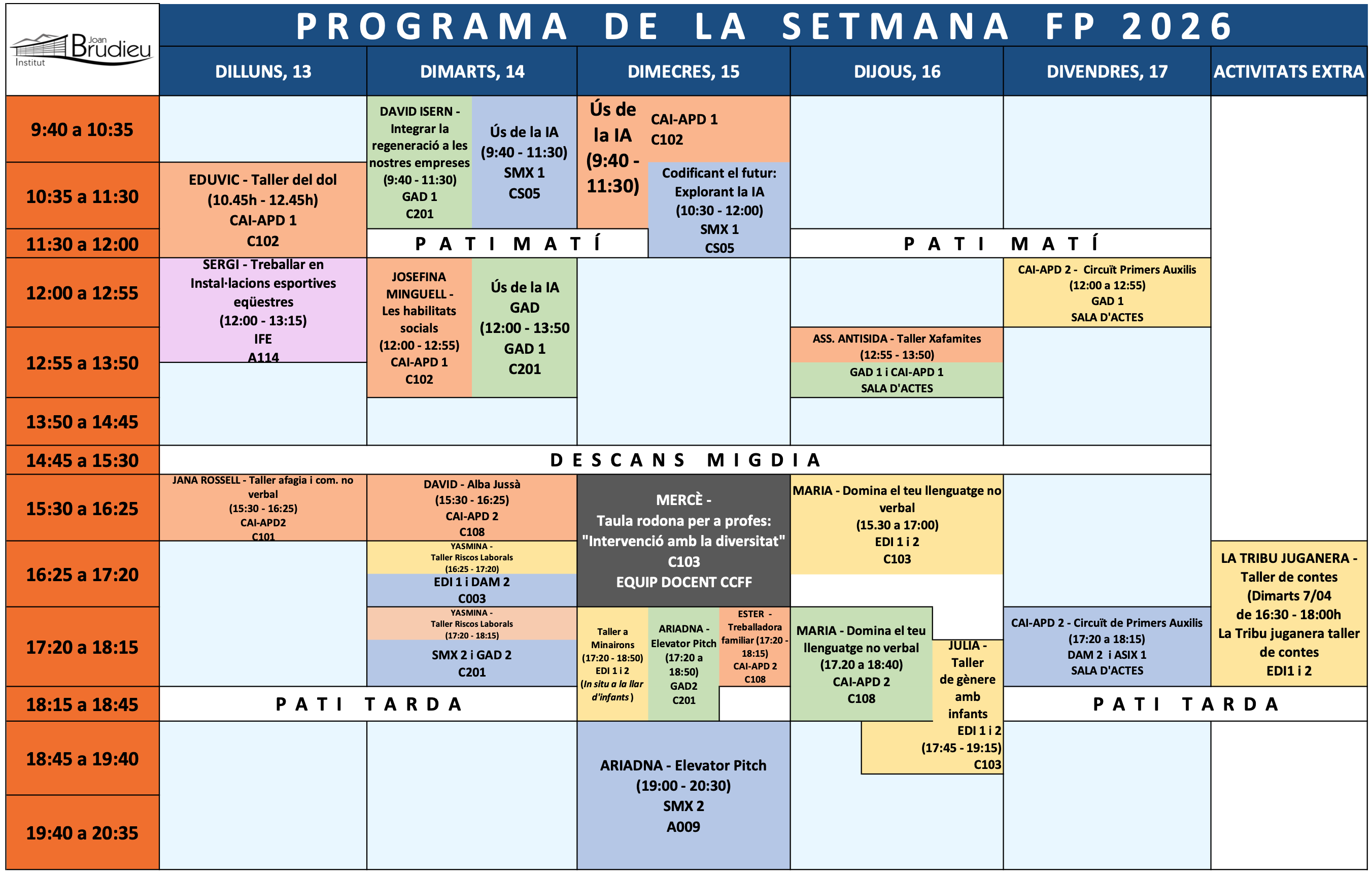 Al llarg de la setmana, l’alumnat podrà participar en sessions sobre l’ús de la intel·ligència artificial aplicada als diferents àmbits, tallers de competències personals i socials, activitats relacionades amb la salut i els primers auxilis, així com propostes vinculades al món laboral i a la innovació. També comptarem amb la participació de professionals externs que compartiran la seva experiència i coneixement.