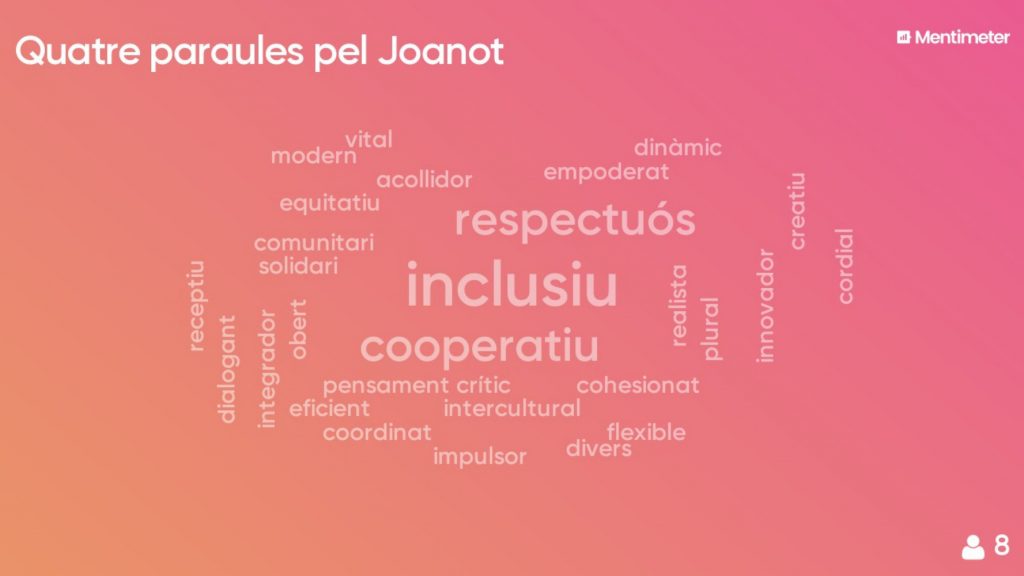El passat dimecres 23 d’octubre, per treballar en un nou Projecte Educatiu de Centre, al claustre del Joanot vam fer un núvol de paraules entre diferents grups de professors i professores. Aquí teniu els adjectius més destacats en la nostra visió de futur del Joanot!