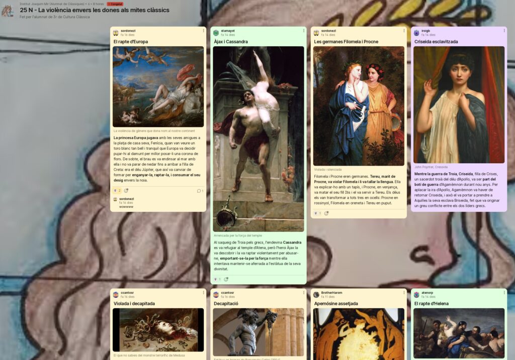 L’alumnat de Cultura Clàssica de 3r d’ESO ha reflexionat sobre les arrels clàssiques de la violència envers les dones en la nostra societat. Ha posat el focus en la violència i el sotmetiment que pateixen deesses, princeses i heroïnes en els mites grecoromans. Com a treball de síntesi, han elaborat aquest Padlet col·laboratiu amb dotze mites narrats per les noies i els nois de la classe des d’una perspectiva de gènere.