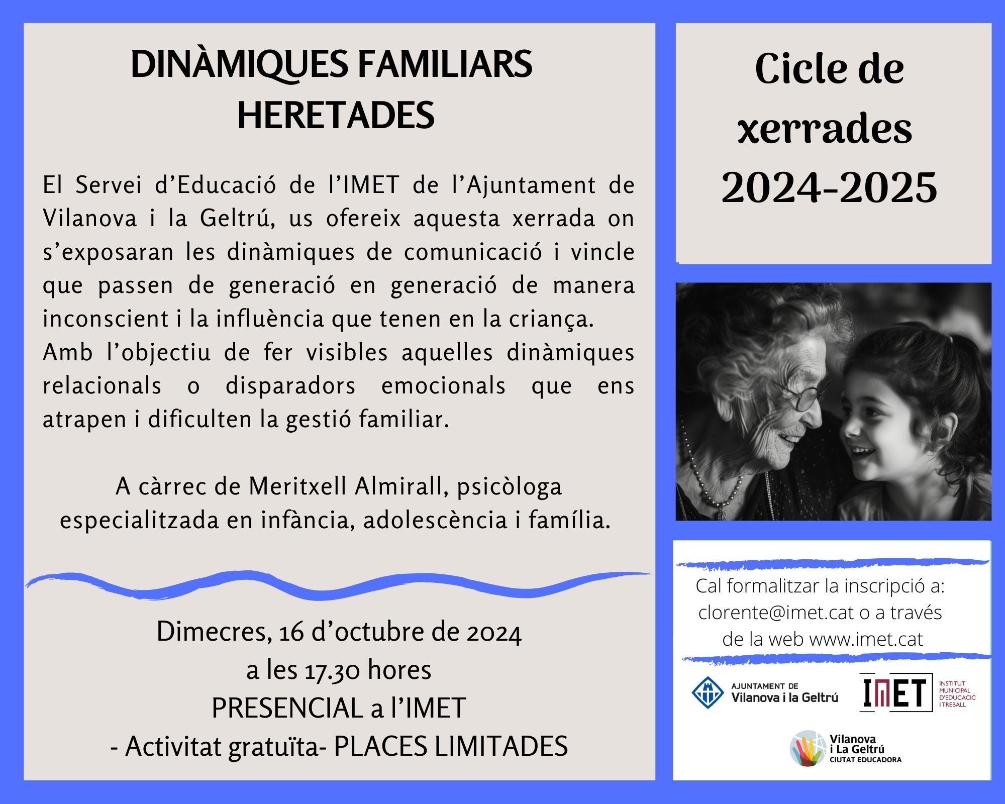Per aquest mes d’OCTUBRE, el Servei d’Educació de l’IMET de l’Ajuntament de Vilanova i la Geltrú us ofereix la xerrada: “DINÀMIQUES FAMILIARS HERETADES”, que tindrà lloc en format PRESENCIAL a l’IMET (C/ Unió, 81), dimecres 16 d’octubre, a les 17.30 hores.