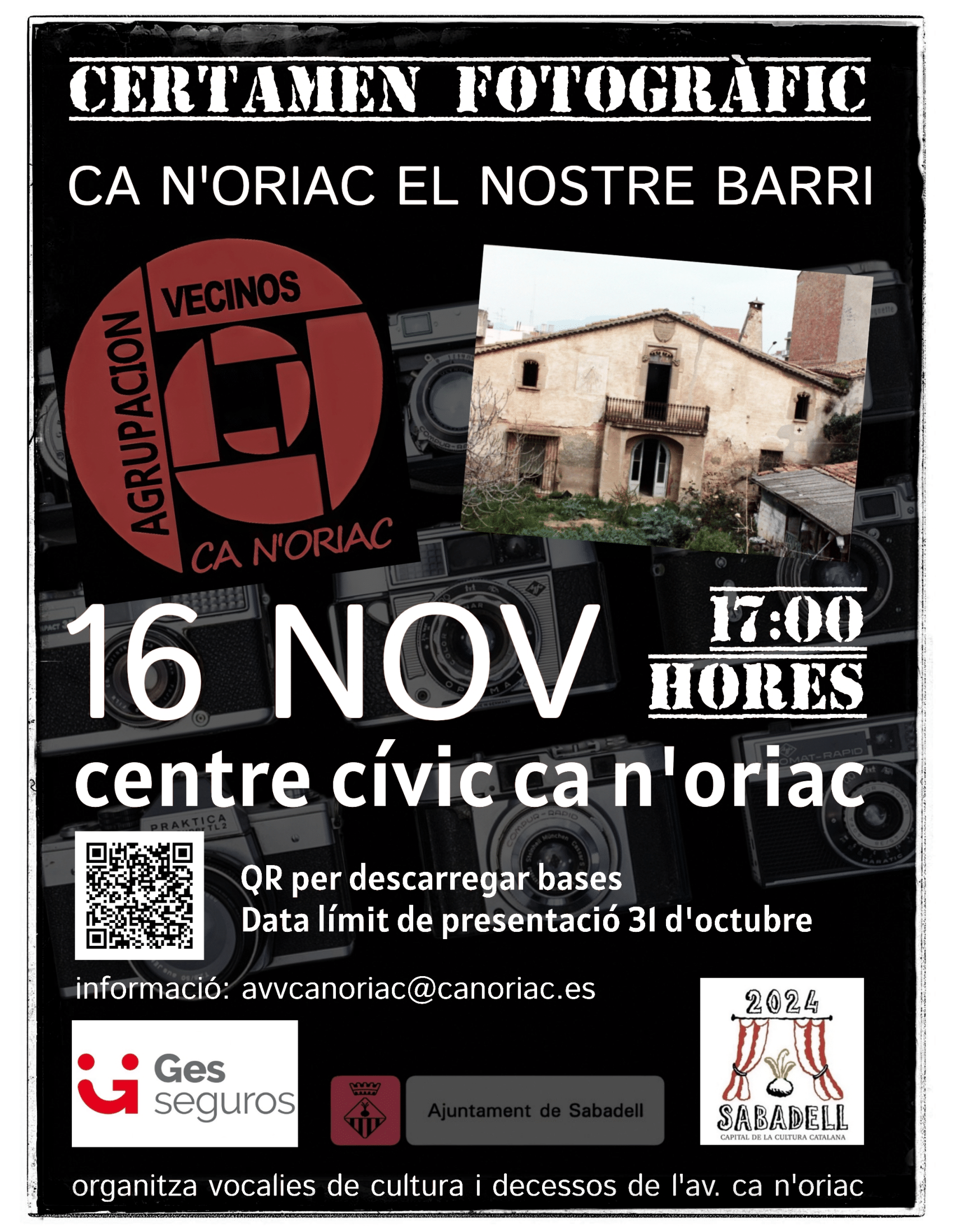 Participa en el Concurs Fotogràfic 2024/25 de l’Associació de Veïns de Ca n’Oriac! Comparteix les teves vivències al barri i guanya premis increïbles en una de les tres categories: 10-14 anys, 15-18 anys o majors de 18. Presenta fins a 3 fotos originals amb el tema “Visualització del nostre barri”, sense fotomuntatges, i explica els valors que vols destacar. Teniu temps fins al 31 d’octubre per enviar les fotos en digital i en paper. Premis com càmeres, impressores i molt més! Consulta les bases i participa!