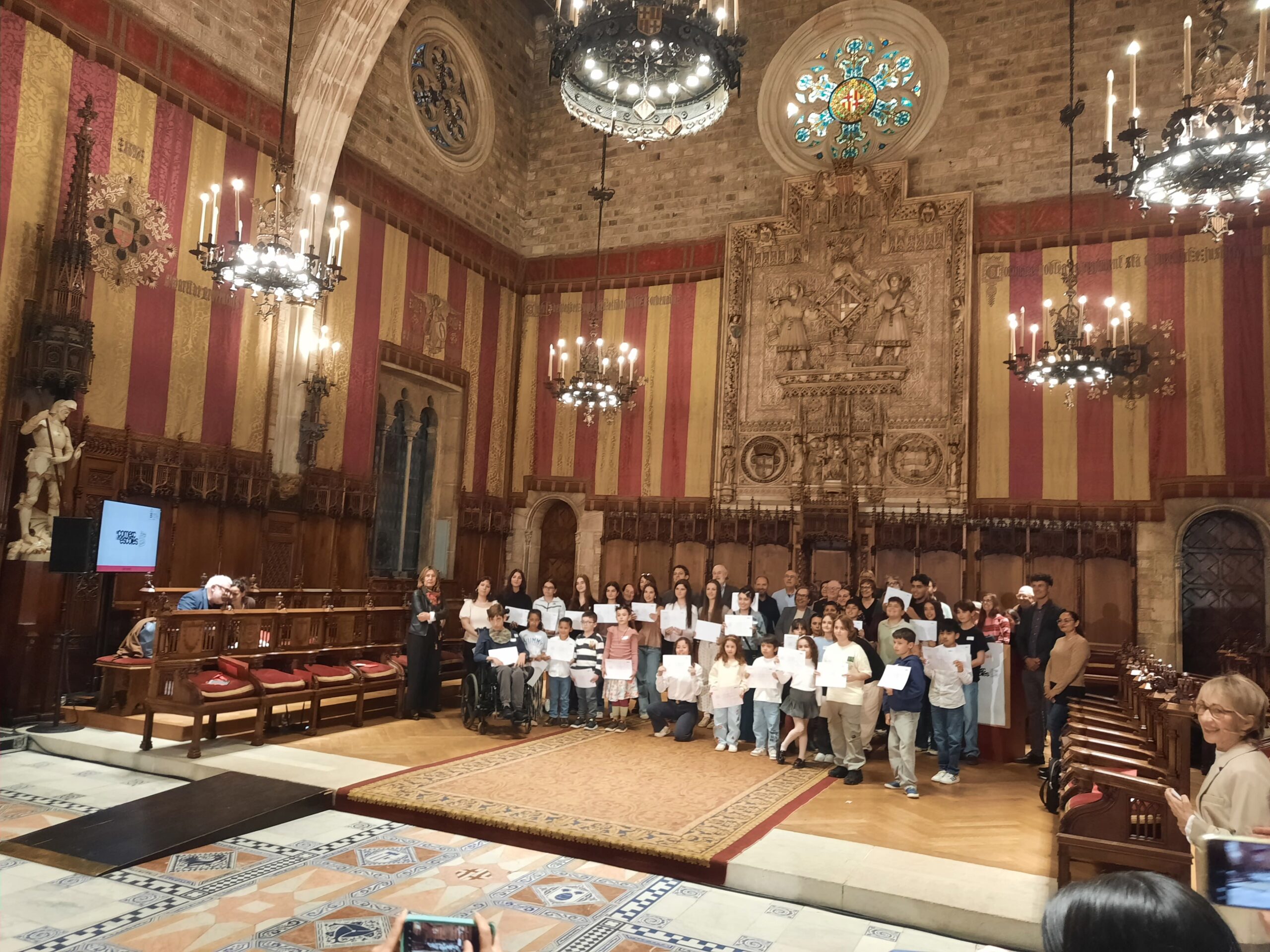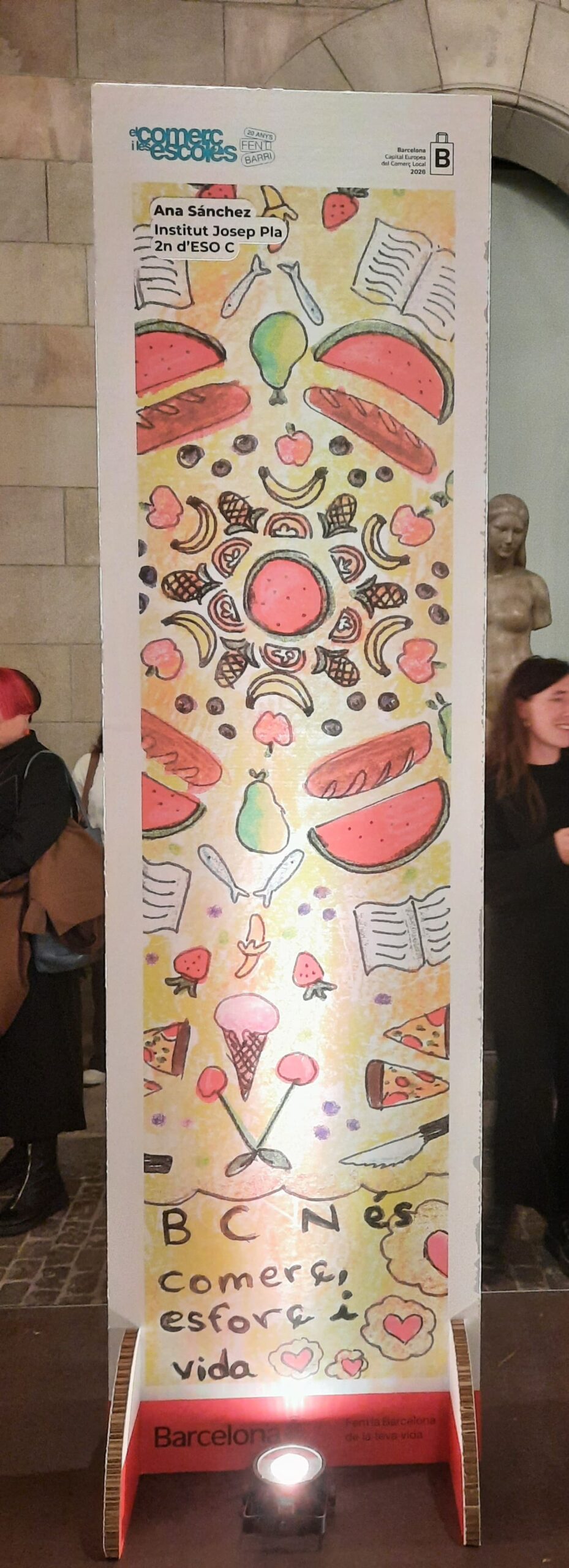 Vam reflexionar sobre els nostres barris per tal d’entendre la importància que tenim tots/s nosaltres com a agents socials actius i responsables. Els comerç ens dona vida, ens ajuda a crear vincles i fa que els nostres barris estiguin plens de vitalitat. De tots els treballs realitzats vam seleccionar-ne 12 per tal de participar en el Concurs. Finalment, el punt de llibre premiat, en la categoria de 1r i 2n ESO, va ser el de la nostra alumna de 2nC, Ana Sánchez, amb la qual vam anar a recollir el premi en l’acte que es va organitzar, el dimarts d’aquesta setmana, en el Saló de Cent de l’Ajuntament i vam poder gaudir també de la bellesa d’aquest emblemàtic espai. Volem felicitar a l’Ana per la seva enorme creativitat i a tot l’alumnat de 2n ESO per l’esforç i l’entusiasme dedicat en aquesta tasca.