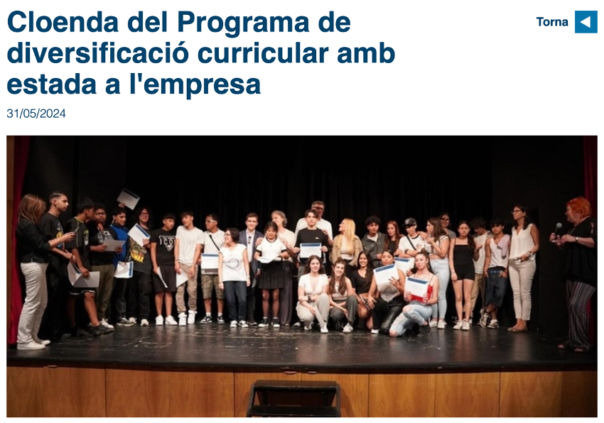 A final d’aquest curs es va celebrar l’acte de cloenda del Programa de diversificació curricular amb estada a l’empresa del curs 2023-2024, en el qual hi han participat 10 alumnes de 4t d’ESO del nostre centre i alumnes de 19 centres més i 179 empreses de Barcelona.