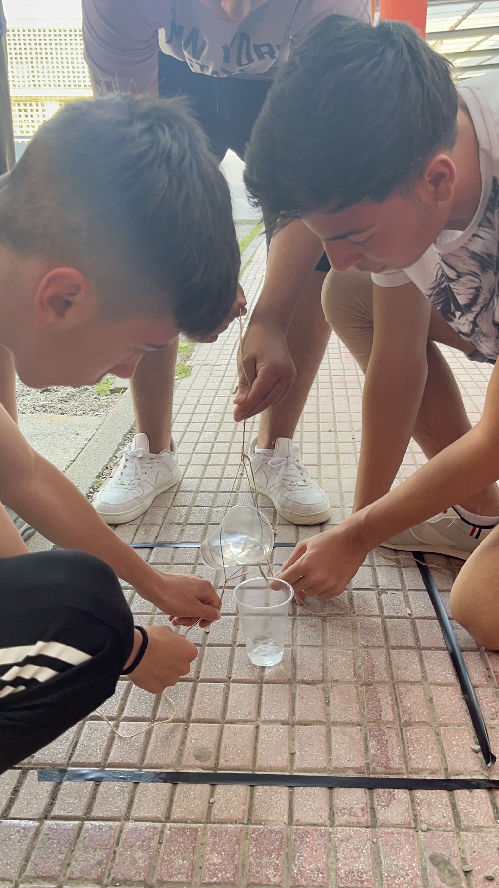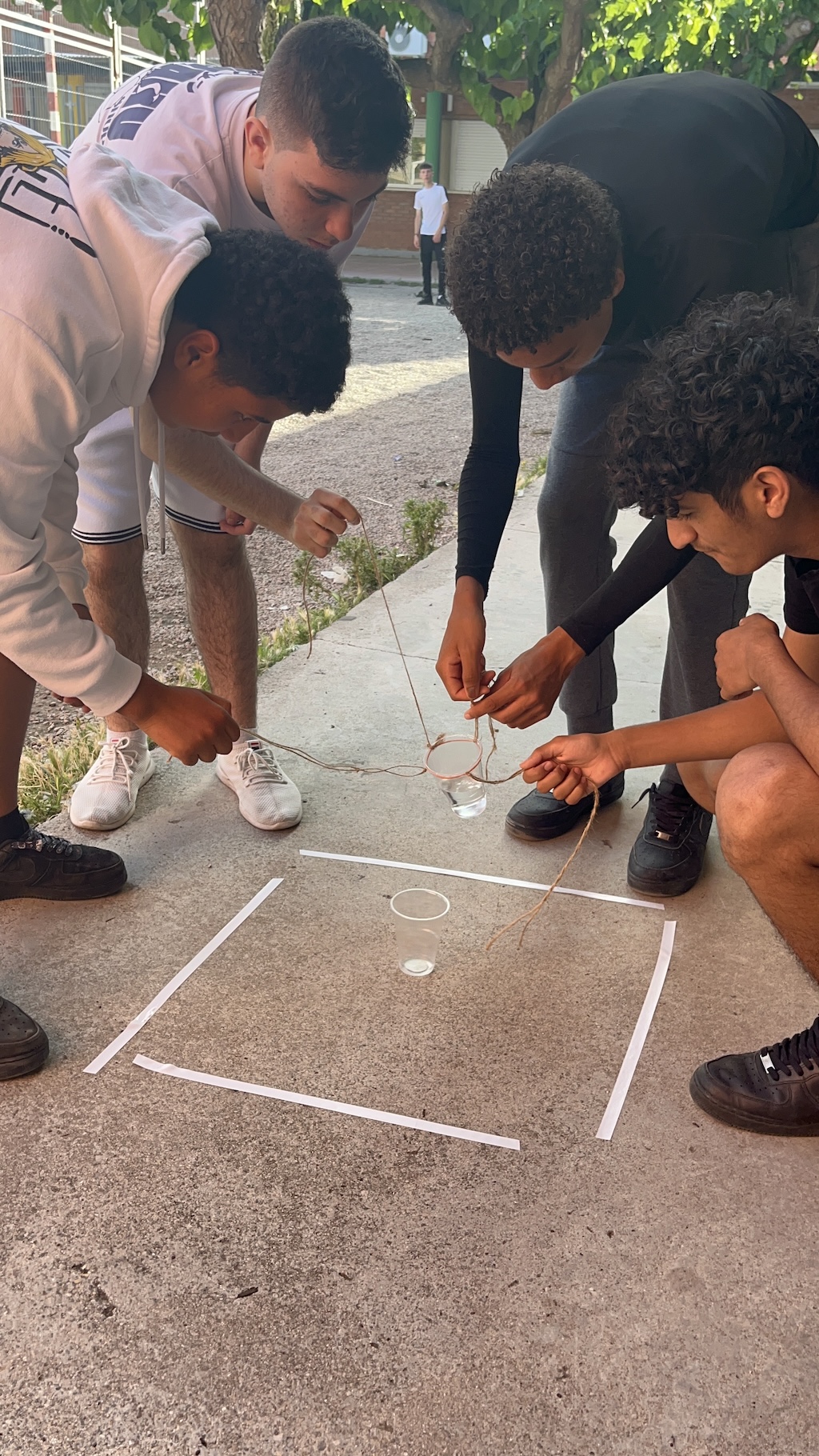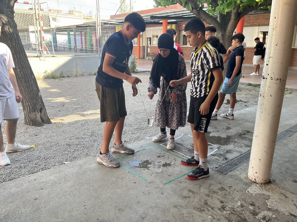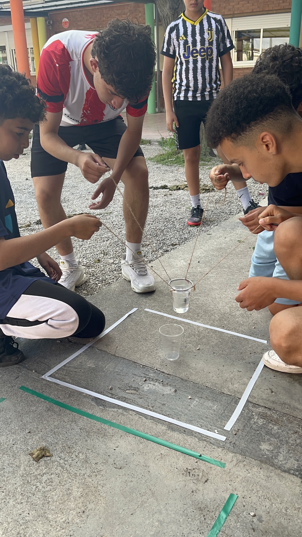 Aquesta setmana, els alumnes de l’optativa de 3r d’ESO d’Emprenedoria han treballat una dinàmica de grup que consistia a transvasar aigua d’un got a un altre, de forma grupal i amb l’ajuda d’una goma elàstica i tantes cordes com participants.