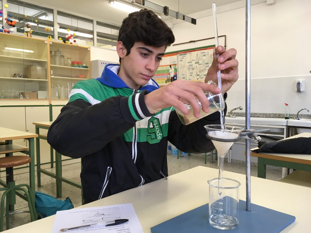 Als nostres alumnes de 2n d’ESO els encanta experimentar. Com que estan estudiant les mescles, van anar al laboratori per intentar separar una mescla d’aigua, sal i sorra, cosa que van aconseguir amb èxit.