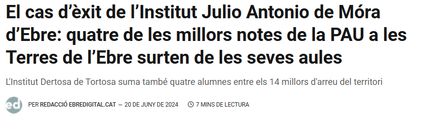 Més de 700 estudiants de les Terres de l’Ebre i Priorat (font) s’han examinat aquest mes de juny de la selectivitat a la nostra demarcació. L’Institut Julio Antonio hi ha aportat 43 alumnes, que correspon al 6% del total. Dels 700 alumnes, si es consideren les 6 millors notes, 3 són d’alumnes del nostre institut i han obtingut una nota igual o superior al 9,5. Una d’elles, la Laura Hernández Cabré ha aconseguit una qualificació final de 13,75/14. També cal destacar que tot l’alumnat ha superat la prova.
