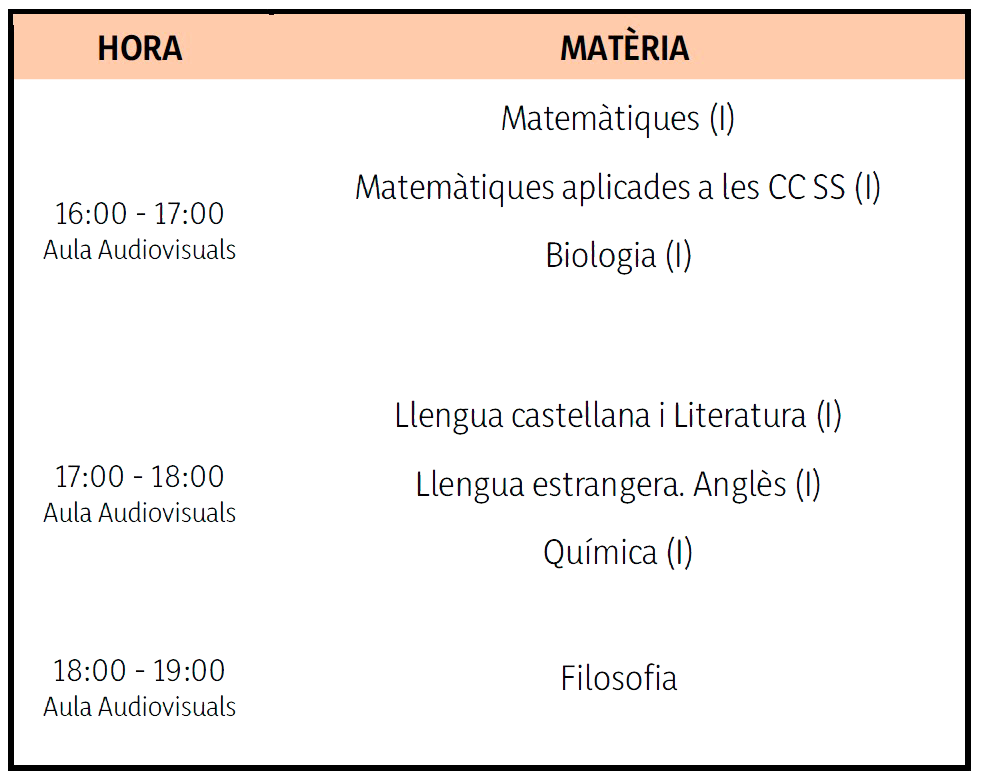 Recuperació de matèries pendents de 1r de batxillerat Feu un comentari / Per coordinaciotac / 18/12/2024 / General Sin categoría Les recuperacions de matèries pendents de 1r de batxillerat es realitzarà el dimecres 8 de gener de 2025 d’acord amb el següent horari: