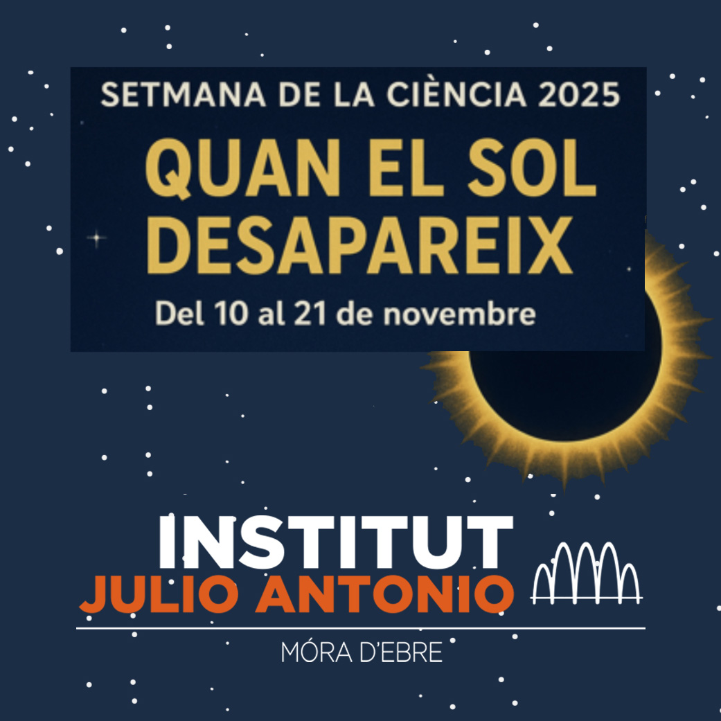 La setmana del 14 al 21 de novembre hem celebrat la Setmana de la Ciència al nostre Institut Julio Antonio. Enguany l’hem dedicada a un esdeveniment extraordinari: l’eclipsi solar total del proper 12 d’agost de 2026, que a les nostres terres podrem observar durant més d’un minut. Tindrem un alineament gairebé perfecte de la Lluna, el Sol i la Terra, que farà que la Lluna tapi completament el disc solar.