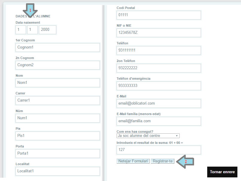 Com registrar-te a Matrícula Guia de l’usuari Benvinguts a la guia per usuaris. A continuació us explicarem els passos recomanats per a registrar-vos i iniciar sessió correctament amb el nou disseny de la pàgina web. Abans de poder iniciar la sessió, es necessari registrar-ne les dades del alumne en la web. Accediu al enllaç “REGISTRAR-TE” i s’obrirà una taula amb totes les dades personals que s’han d`introduir per poder registrar-te. Analitzeu que les vostres dades s’han introduït correctament en tots els camps. (fletxa1) Especialment el DNI d’usuari que es requereix per a iniciar la sessió i el correu que es on ens enviaran la contrasenya.(La resta de dades es poden modificar abans de crear la matrícula). Una vegada omplert el formulari, fem clic al botó registrar-te (fletxa2). En el cas d’haver introduït el correu de forma equivocada o de no rebre la contrasenya heu d’accedir a la pestanya “Eliminar usuari”, en el menú superior de la pàgina. S’obrirà una taula on haureu d’introduir el vostre DNI/NIF. Una vegada eliminat l’usuari, tindreu que tornar a registrar-vos. Una vegada heu registrat correctament l’usuari, rebreu un correu amb informació del vostre compte això com la vostra contrasenya per iniciar sessió. Accediu a la pestanya “Inici de sessió” en el menú superior de la pàgina i s`obrirà el formulari per poder iniciar sessió. En aquesta pàgina heu d’introduir el DNI que heu posat a l’hora de registrar-vos i la contrasenya que heu rebut per al correu electrònic (fletxa1). Una vegada introduïdes les dades, feu clic al botó “Entrada”. Aplicació de matrícula CCFF