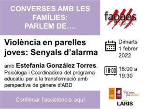 Davant l’increment d’interès de moltes famílies davant situacions de violències entre algunes parelles dels nostres fills i filles, i amb la voluntat de voler donar eines per detectar senyals d’alarma per a la prevenció i acostar estratègies que els ajudin a ells i elles també a detectar-les, us convidem a participar el dimarts 1 de febrer a les 18:00h al webinar “Violència en parelles joves: senyals d’alarma”.