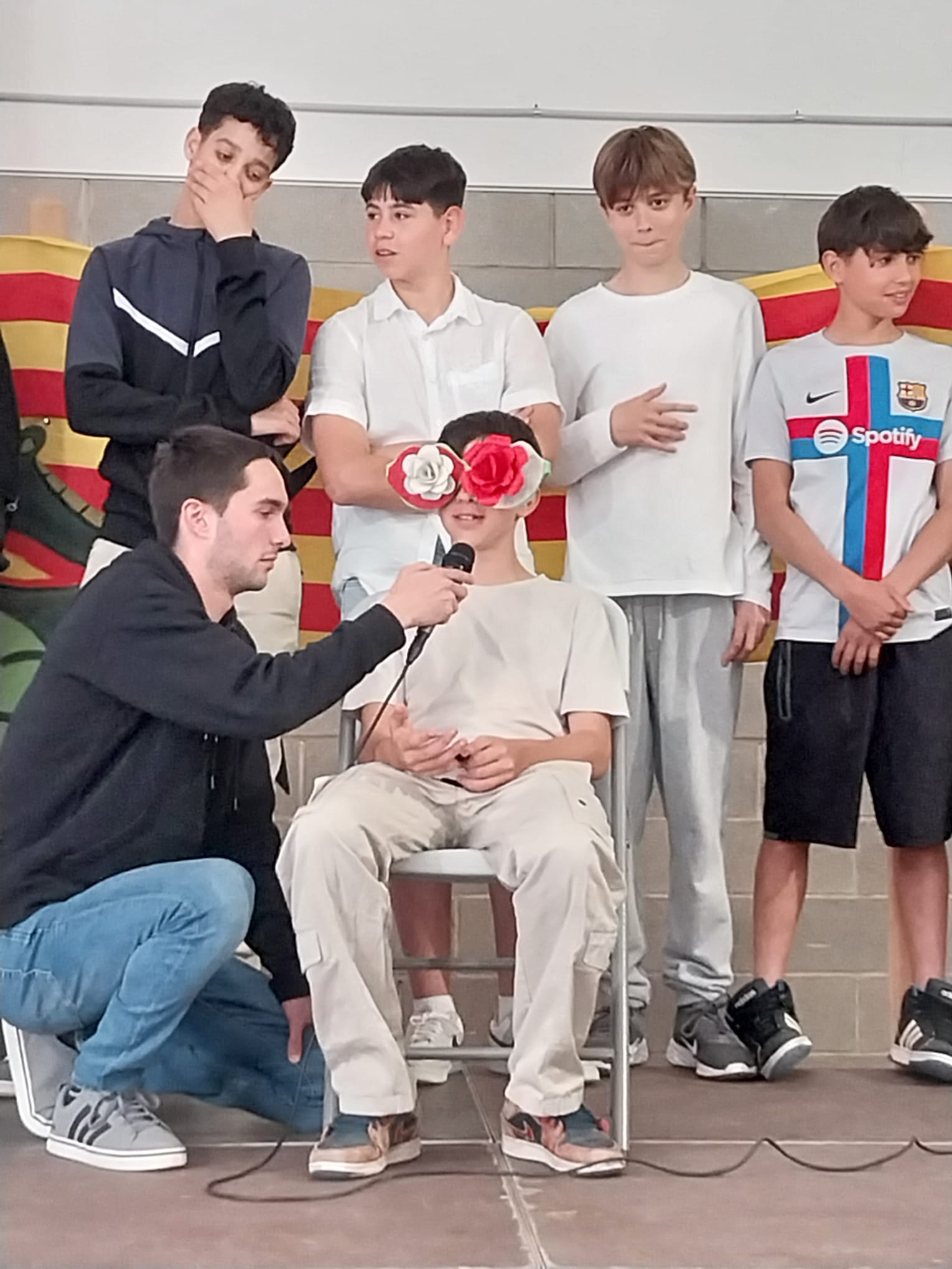 La Comissió de la Biblioteca Escolar, que havia proposat els concursos Literari i Fotogràfic, va ser l’encarregada d’organitzar els actes de celebració a la sala polivalent, un d’adreçat als alumnes de 1r i 2n d’ESO i un altre als de 3r i 4t d’ESO. Els alumnes de 1r de Batxillerat de la matèria “Creació literària” van ser qui van preparar l’acte, que va presentar majoritàriament l’alumne Òscar Salas. Al llarg d’aquest, va haver-hi una mostra dels treballs que els alumnes han estat fent al llarg del curs a “Creació literària”, un concurs de recitació en francès en què els alumnes finalistes van optar a un premi amb la recitació del poema “La Cigale et la Fourmi”, de Jean de La Fontaine, lectura de textos diversos amb acompanyament musical (a càrrec de la Comissió de Coeducació), lectura per par de l’alumnat de l’Aula d’Acollida dels desitjos de l’arbre instal·lat al centre amb motiu del Dia de la Pau, un ball protagonitzat per algunes alumnes de 2n de batxillerat, la final del concurs “Picalletres” i el lliurament de premis de tots els concursos que s’han portat a terme les darreres setmanes (Literari, Fotogràfic, “Qui és qui?”, de recitació en francès i “Picalletres”). Totes els alumnes premiats van rebre una rosa, un llibre i entrades dobles al cinema, que va finançar l’AFA. Podeu consultar els premiats en aquest enllaç.