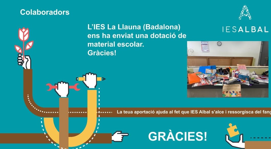Des d’aquí volem donar les gràcies a l’alumnat i famílies que han contribuït a recollir material per a l’IES Albal, afectat per la DANA. Hem estat en contacte amb ells i finalment els hem lliurat el material que ens heu fet arribar. Gràcies a tothom i enviem molta força per als companys i famílies que intenten recuperar la normalitat.