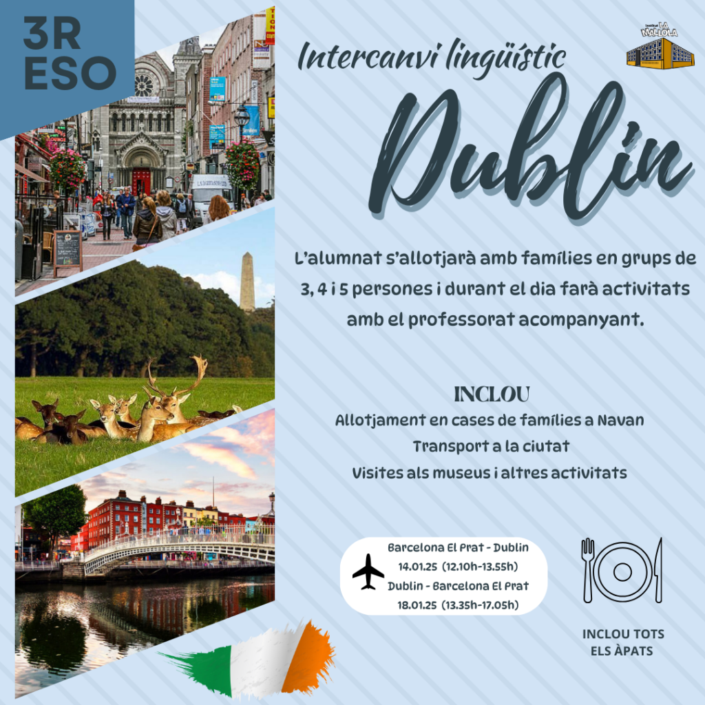 Viatge a Dublín (març): Un clàssic de l’INS La Mallola! Els nostres estudiants viatjaran a Dublín per perfeccionar el seu anglès en un entorn d’immersió total. Durant l’estada, l’alumnat s’allotjarà amb famílies irlandeses, cosa que els permetrà practicar l’idioma de forma natural i conèixer la cultura local de primera mà.