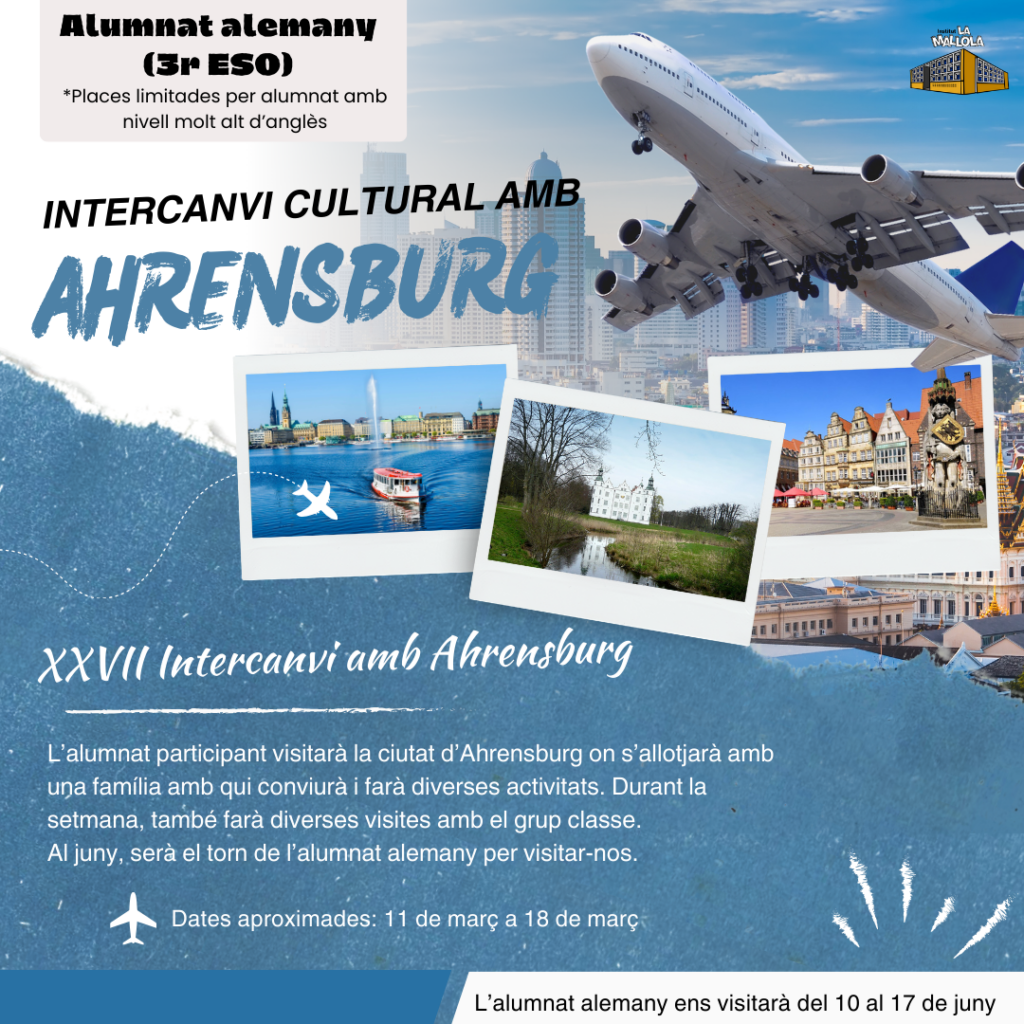 Intercanvi amb Ahrensburg (Alemanya, març-juny): Aquest intercanvi amb la ciutat alemanya d’Ahrensburg, a prop d’Hamburg, és una experiència cultural i educativa inoblidable. Els nostres alumnes visitaran Ahrensburg al març i seran acollits per famílies alemanyes. Posteriorment, els alumnes alemanys ens visitaran al juny. Una manera fantàstica de conèixer una nova cultura i fer amics internacionals!