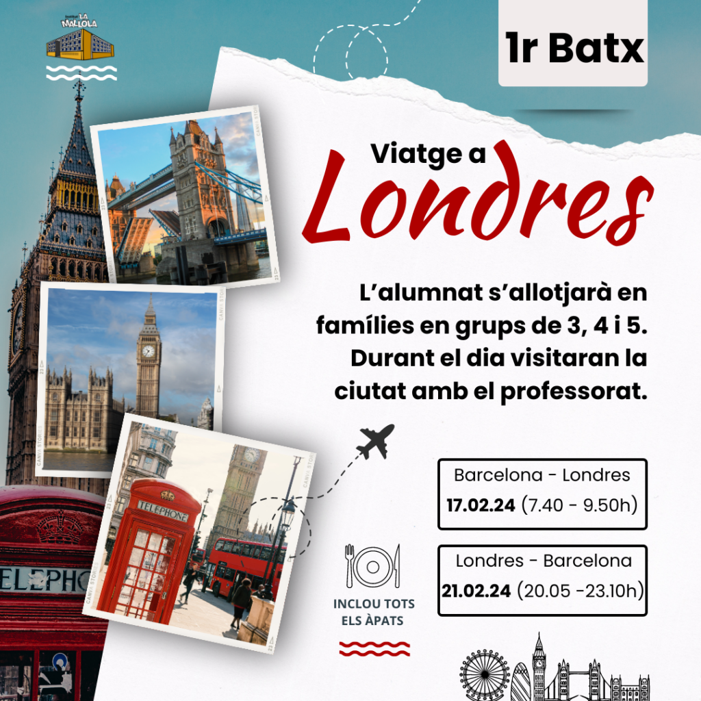 Els estudiants de 1r de Batxillerat viatjaran a Londres amb l’objectiu de perfeccionar el seu nivell d’anglès i explorar una de les ciutats més dinàmiques i influents del món. Igual que a Dublín, els nostres alumnes s’allotjaran amb famílies locals, fet que els permetrà millorar la fluïdesa en anglès i viure el dia a dia dels londinencs. A més, tindran l’oportunitat de descobrir llocs emblemàtics com el Big Ben, el British Museum o el Tower Bridge.