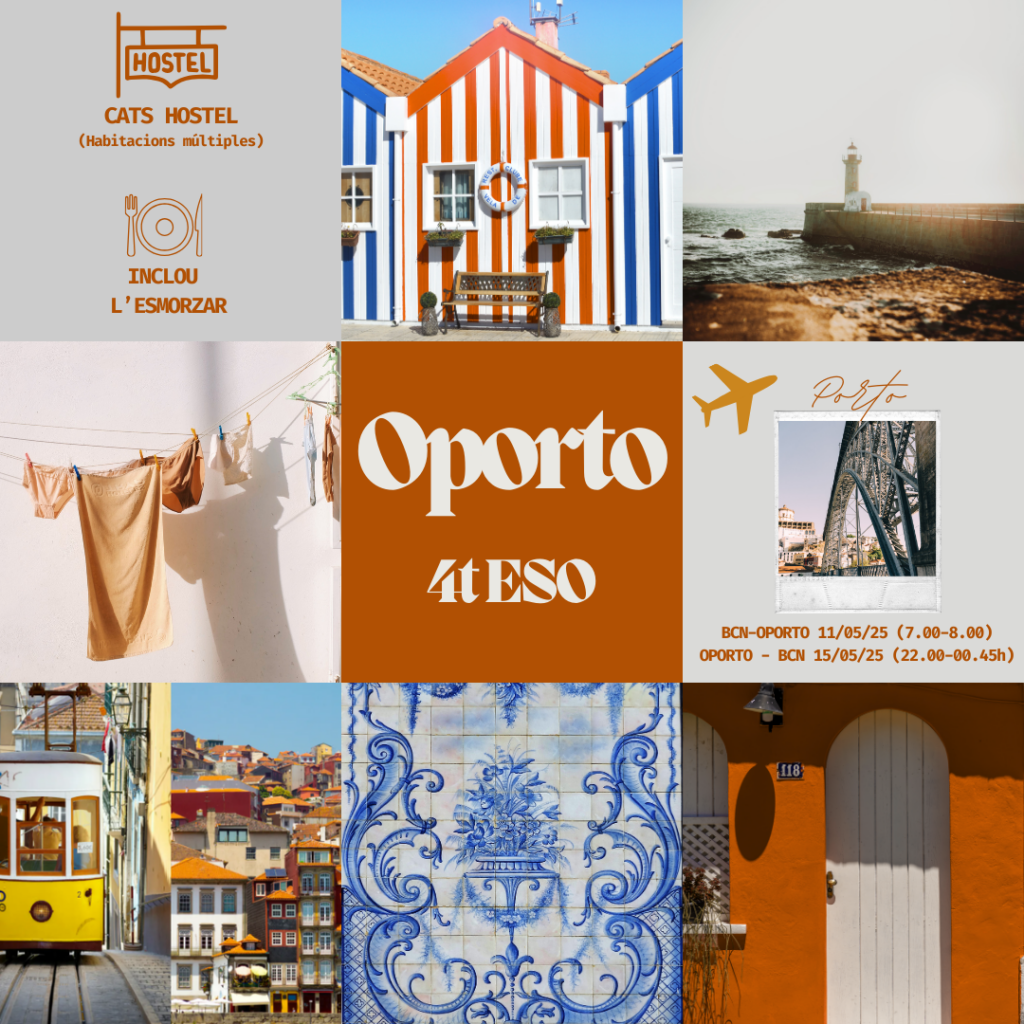 Com a gran novetat d’aquest curs, els estudiants de 4t d’ESO viatjaran a Porto, Portugal, per celebrar el seu viatge de final d’etapa. Aquest viatge, que es farà al juny, serà l’oportunitat perfecta per acomiadar-se de l’ESO mentre gaudeixen de la història, la cultura i l’encant d’una de les ciutats més belles de Portugal. Sens dubte, una experiència per recordar tota la vida!