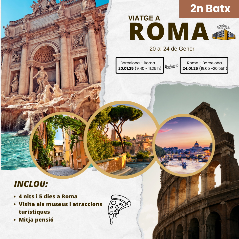 Per als alumnes de 2n de Batxillerat, com cada any, proposem un viatge espectacular a Roma, Itàlia. En plena recta final del Batxillerat, podran visitar monuments històrics com el Colosseu, el Vaticà o el Fòrum Romà, tot mentre gaudeixen d’una ciutat plena de cultura i història. Una manera ideal de culminar la seva etapa a l’INS La Mallola abans de començar una nova fase en la seva formació.
