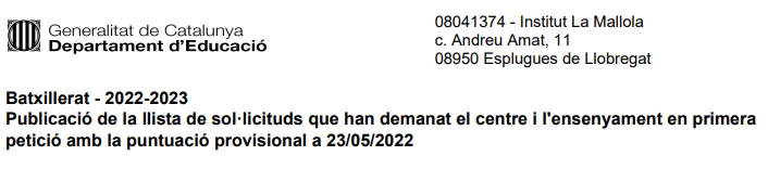 BATXILLERAT: llista de sol·licituds que han demanat el centre i l’ensenyament en primera petició amb la puntuació provisional a 23/05/2022 Feu un comentari / Per admin / 25/05/2022 / General Portada CLICA LA IMATGE PER ACCEDIR A LA INFORMACIÓ