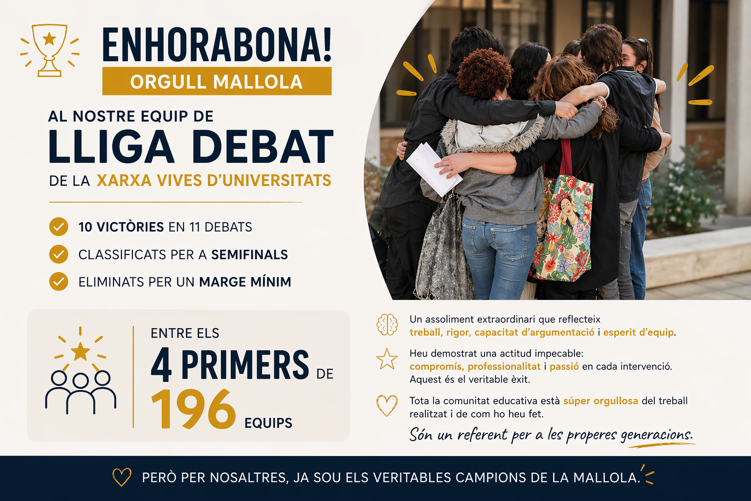 Amb un balanç de 10 victòries en 11 debats i arribant fins a les semifinals, l’alumnat ha demostrat un alt nivell en competències clau com l’oratòria, la capacitat d’argumentació i el pensament crític.