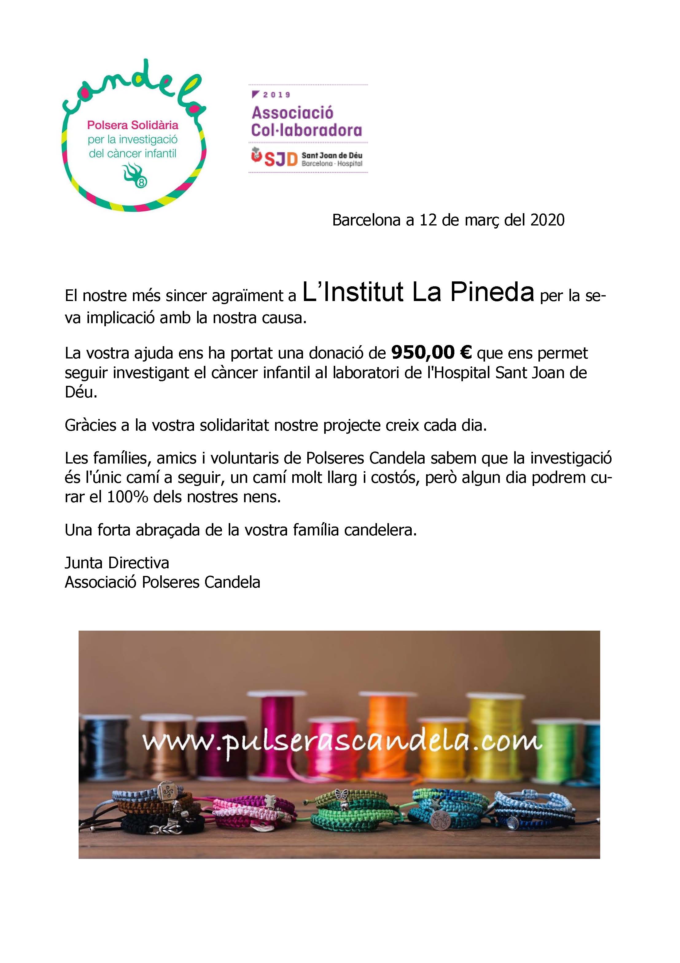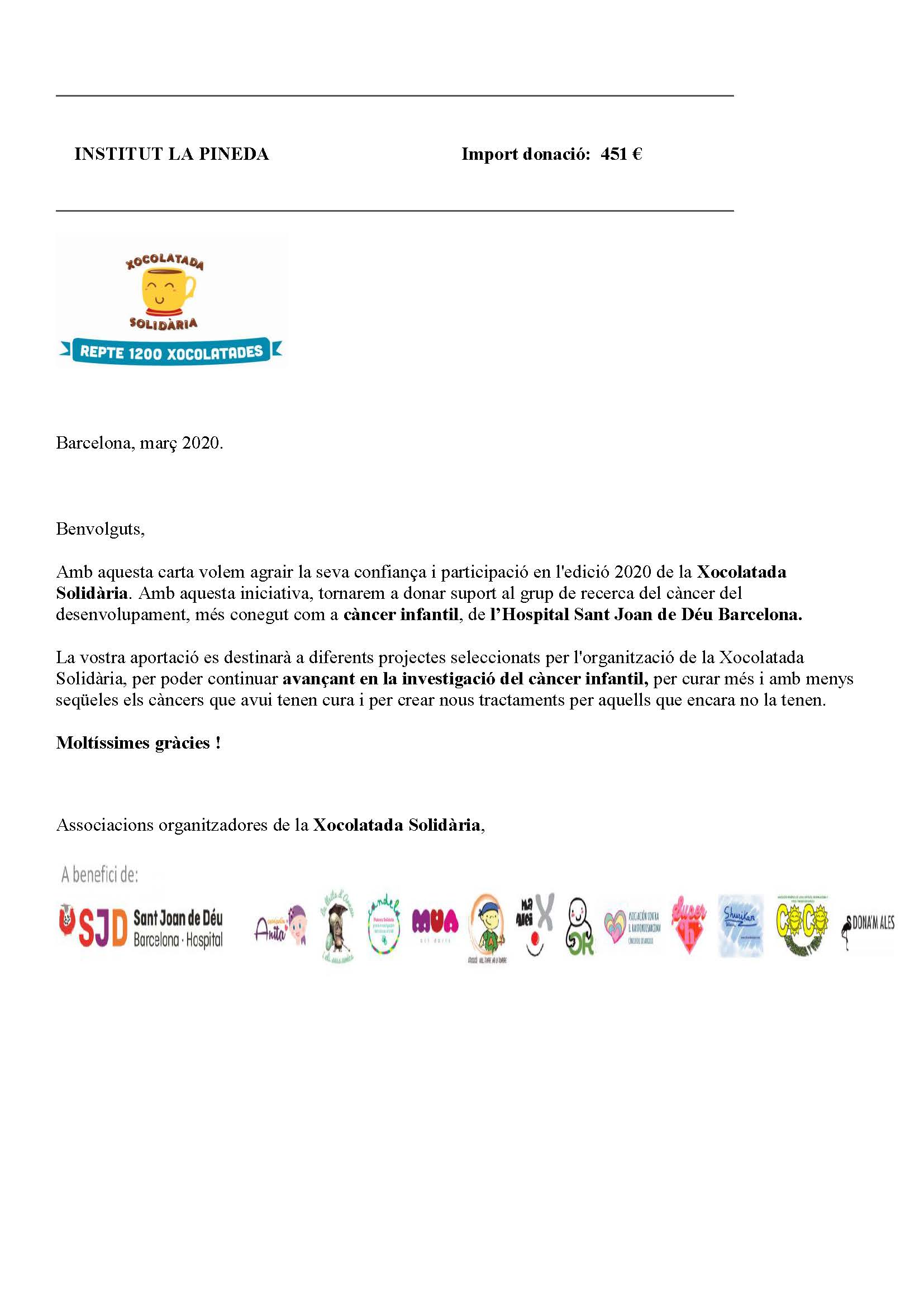 Des d’aquestes línies volem agrair a companys i familiars, excompanys, alumnes de 2n Batxillerat, Ampa i les associacions de veïns de Sant Crist i Coll i Pujol la seva participació desinteressada en la xocolatada solidària en benefici de la investigació pel càncer infantil, que hem celebrat el dissabte 7 de març, en la qual hem recaptat la quantitat de 1401 €