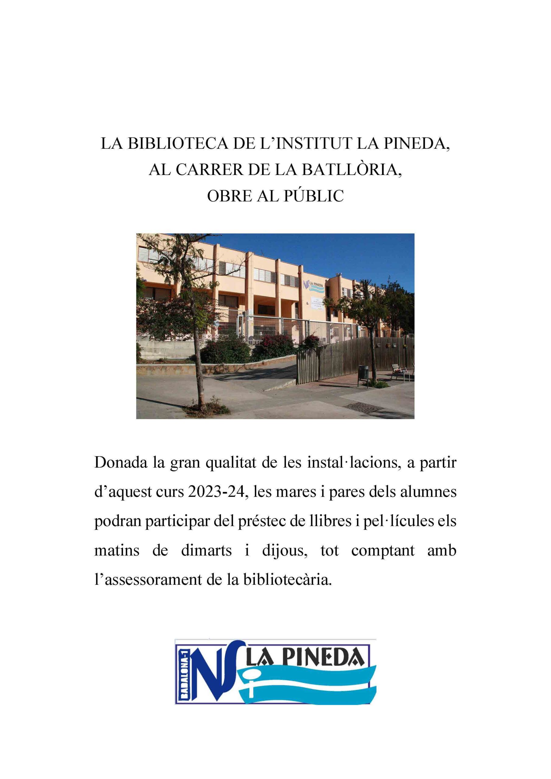 - LA BIBLIOTECA DE L’INSTITUT LA PINEDA OBRE AL PÚBLIC