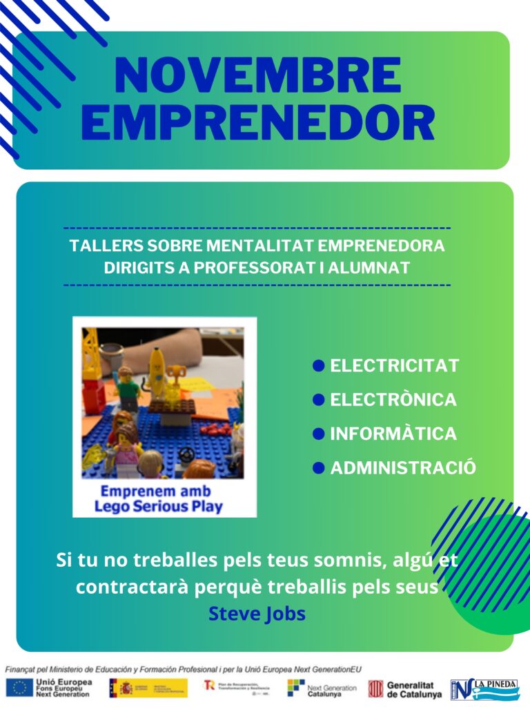 A L’ Institut la Pineda iniciem el mes de l’ emprenedoria, durant aquest mes es realitzaran diferents tallers dirigits al professorat i a l’ alumnat, i orientats a treballar els valors i la mentalitat emprenedora, a través de la metodologia Lego Serious Play, i del Visual Thinking.