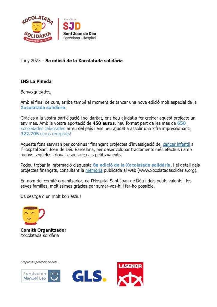 També hem celebrat la xocolatada solidària en favor de la recerca del càncer infantil amb els tallers matemàtics, la participació de la Batumfrau i l’espectacle de màgia, i amb la col·laboració de l’AFA i de l’associació de veïns de Sant Crist de Can Cabanyes!
