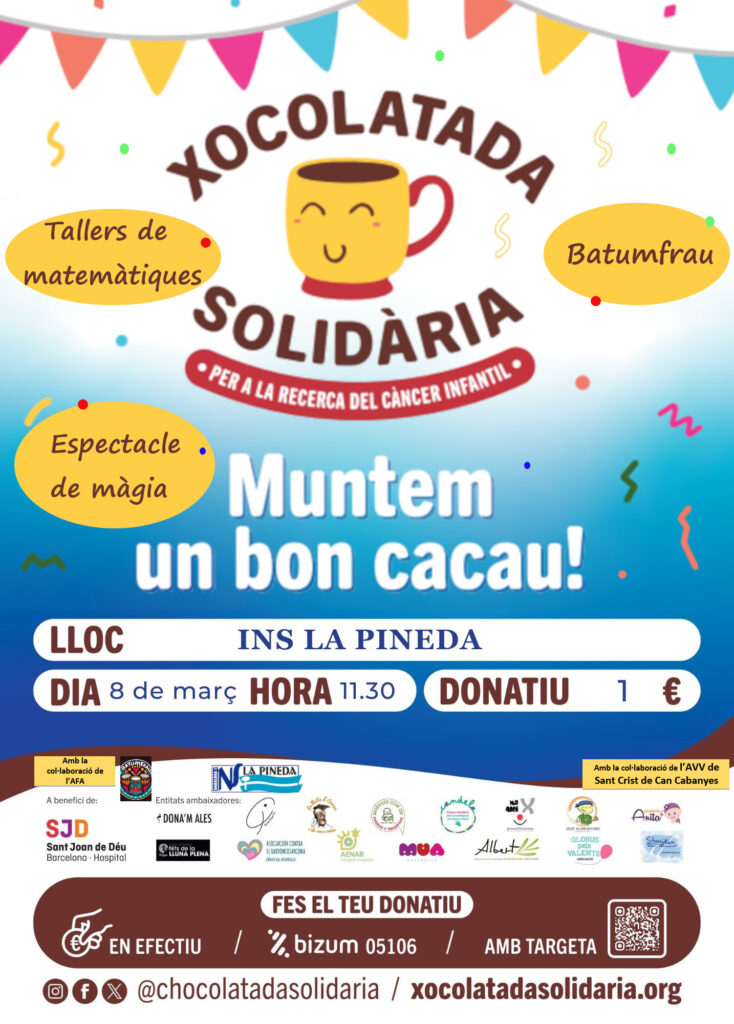 Un any més, l’Institut La Pineda, en col·laboració amb l’Associació de Veïns Sant Crist de Can Cabanyes i la colla de batucada familiar de l’escola Jungfrau, ha decidit adherir-se a la XOCOLATADA SOLIDÀRIA.