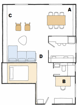 Si mires el dibuix veuràs que proposo 4 localitzacions per a l’encaminador dins d’aquesta casa (A-D). La localització A és una de les pitjors, ha de travessar 3 parets fins a arribar a B. Si el posem a B, passarà el mateix, la cobertura a A estarà molt justa, tot i que la resta de la casa serà bona. La posició de C sembla millor, tot i que ha de travessar alguna paret; i possiblement la millor opció sigui D, encara que és impossible perquè estaria al mig del corredor. Hauràs de trobar, doncs, un equilibri entre la millor localització i la que sigui possible.