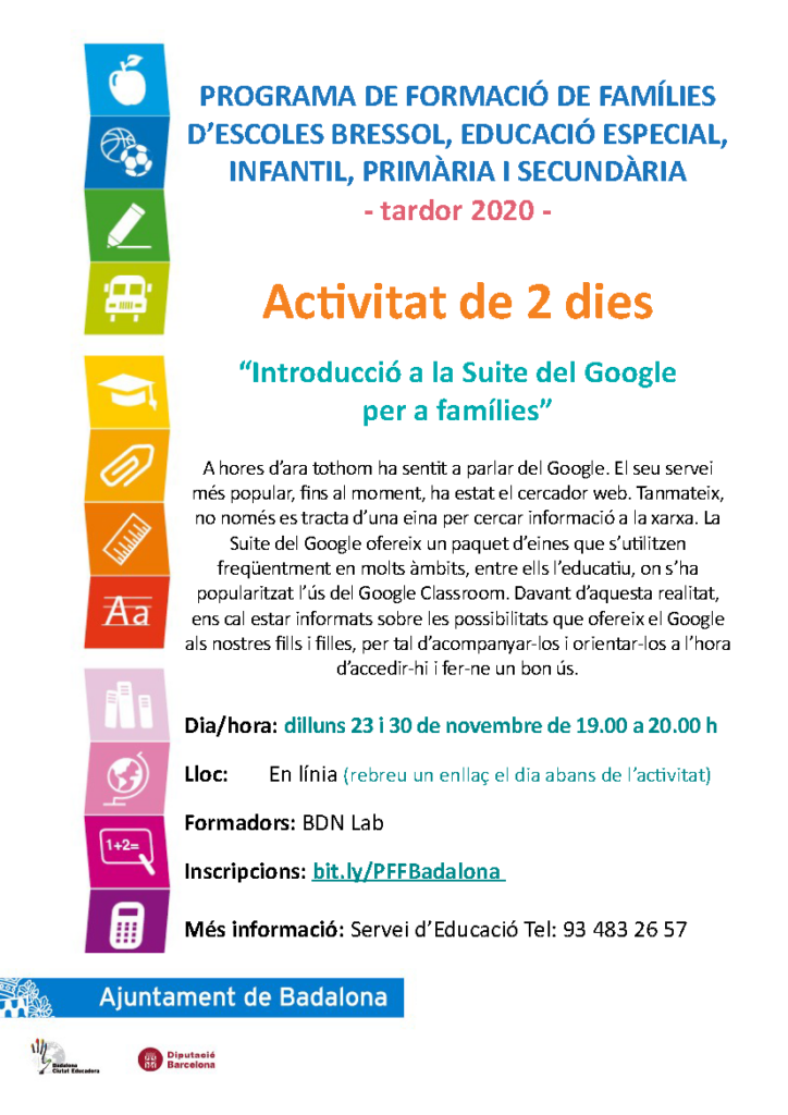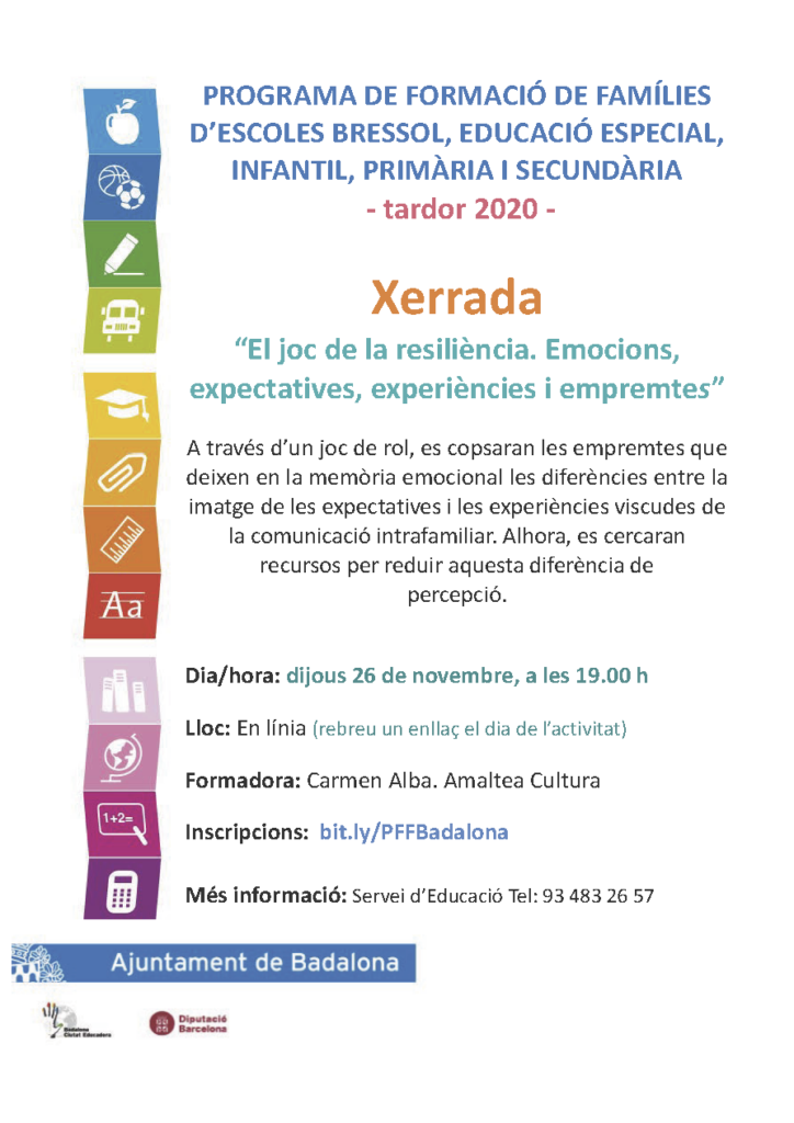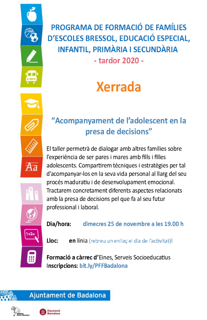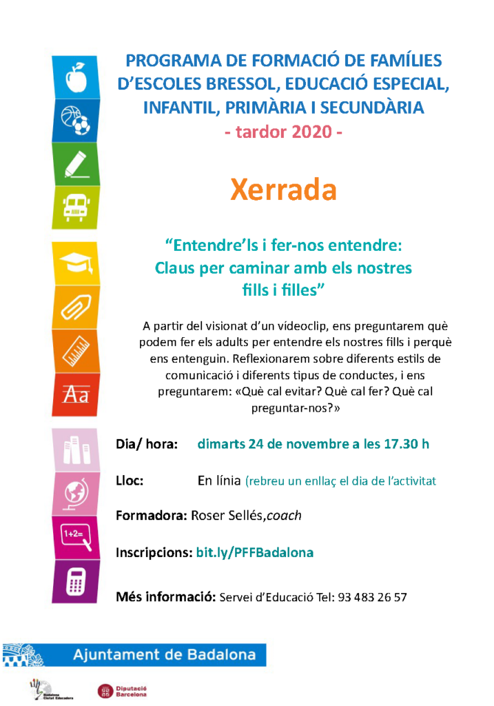 Com cada curs, el Departament d’Educació de l’ajuntament de Badalona en col·laboració amb els centres educatius de la ciutat, organitza unes xerrades adreçades a les famílies.Degut a la situació de pandèmia actual, aquestes xerrades, per a les quals és necessària la inscripció, es realitzaran online.