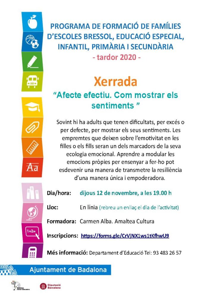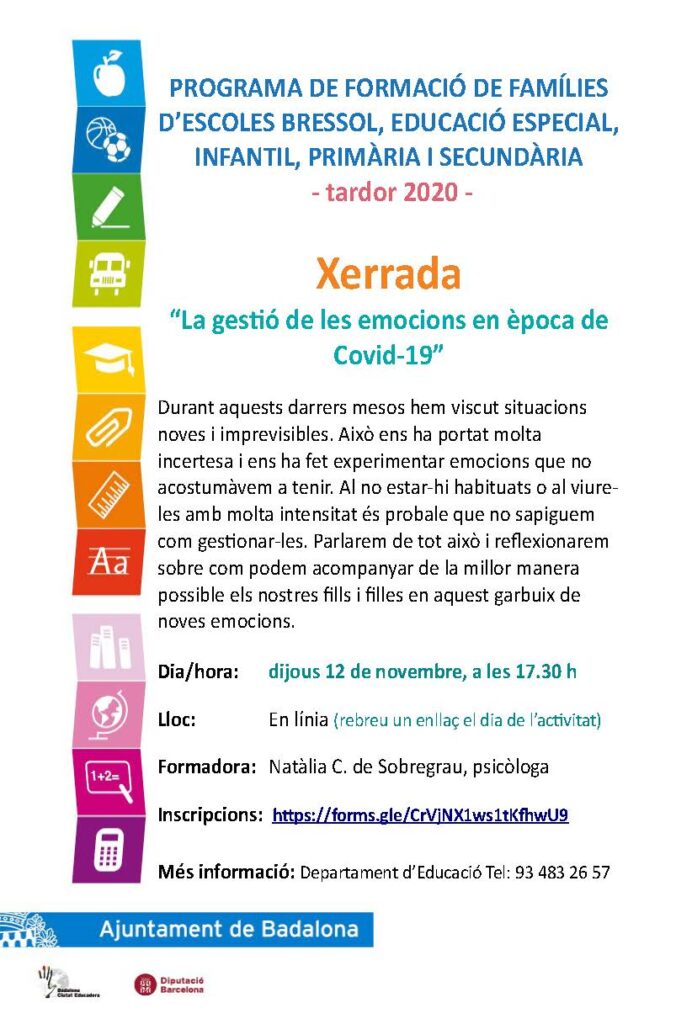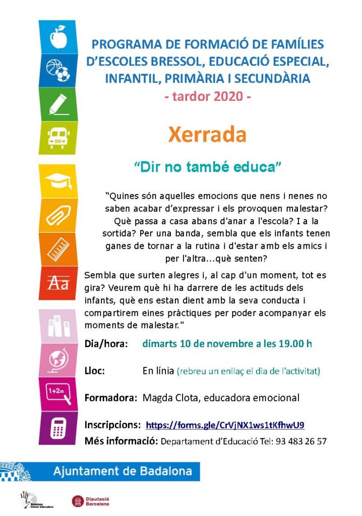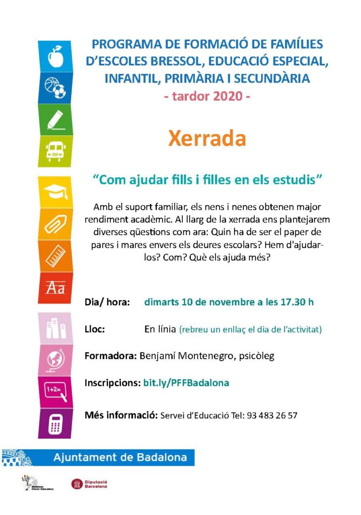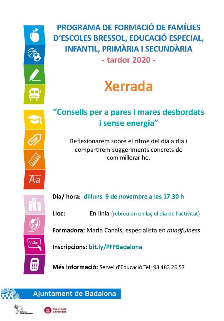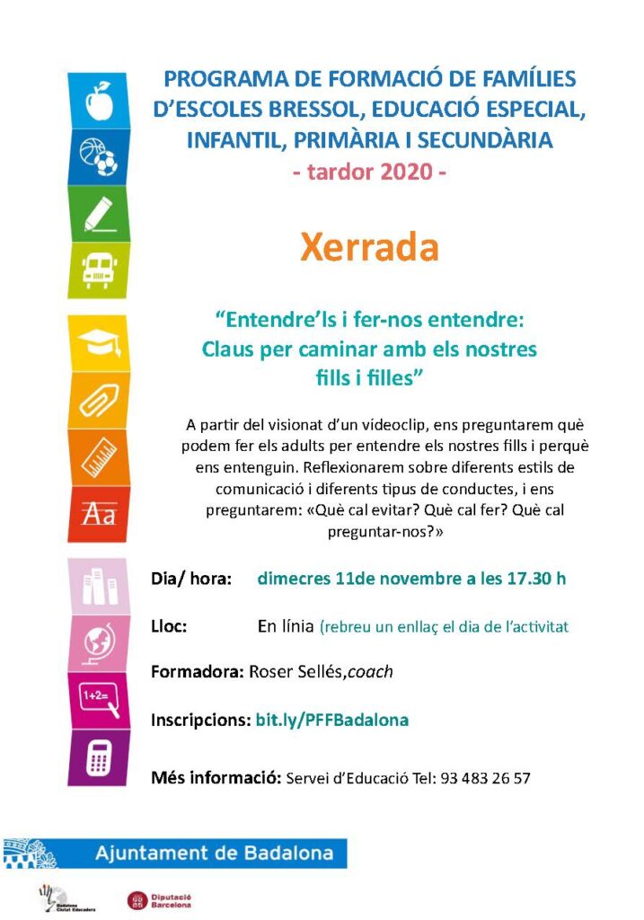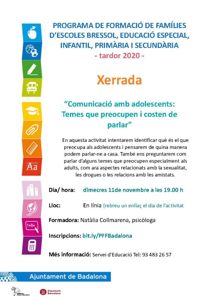 Com cada curs, el Departament d’Educació de l’ajuntament de Badalona en col·laboració amb els centres educatius de la ciutat, organitza unes xerrades adreçades a les famílies.Degut a la situació de pandèmia actual, aquestes xerrades, per a les quals és necessària la inscripció, es realitzaran online.