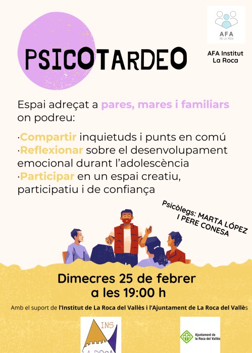 De la mà de l’Espai,Centre de Psicologia, Psicopedagogia i Logopèdia, i gràcies a l’Institut de la Roca i de l’Ajuntament de la Roca del Vallès, farem el primer “PSICOTARDEO”.