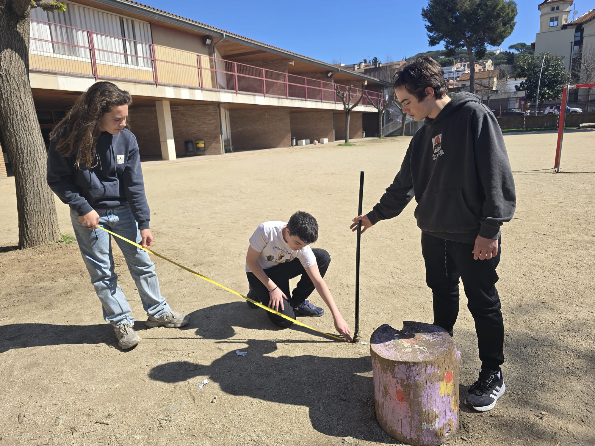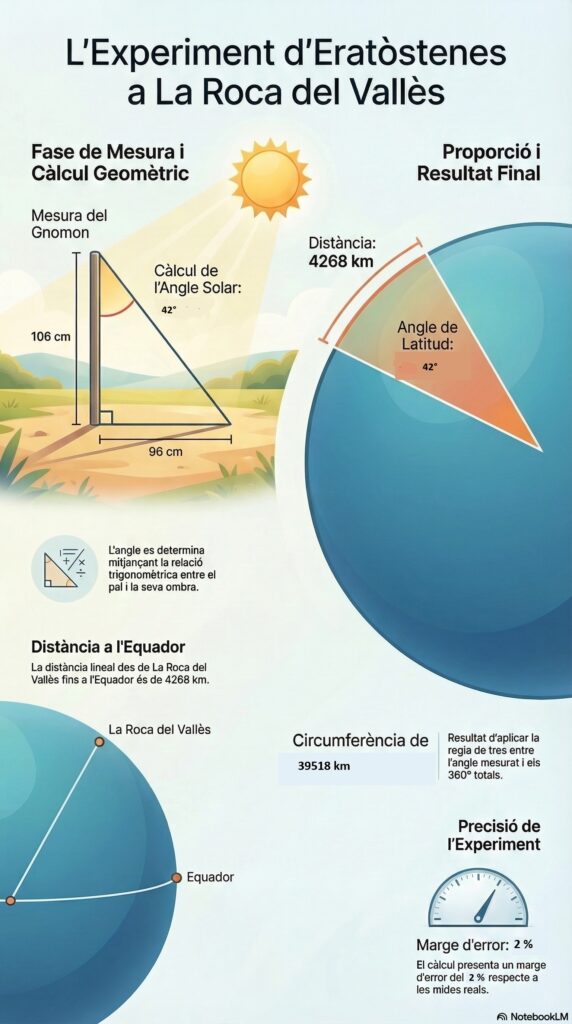 Seguint el procediment d’Eratòstenes, els alumnes van utilitzar un bastó de 106 cm que va projectar una ombra de 96 cm a les 12:00 h. Amb trigonometria tan(α)=ombra/pal, l’angle calculat dels rajos solars respecte a la vertical va ser d’aproximadament 42º.