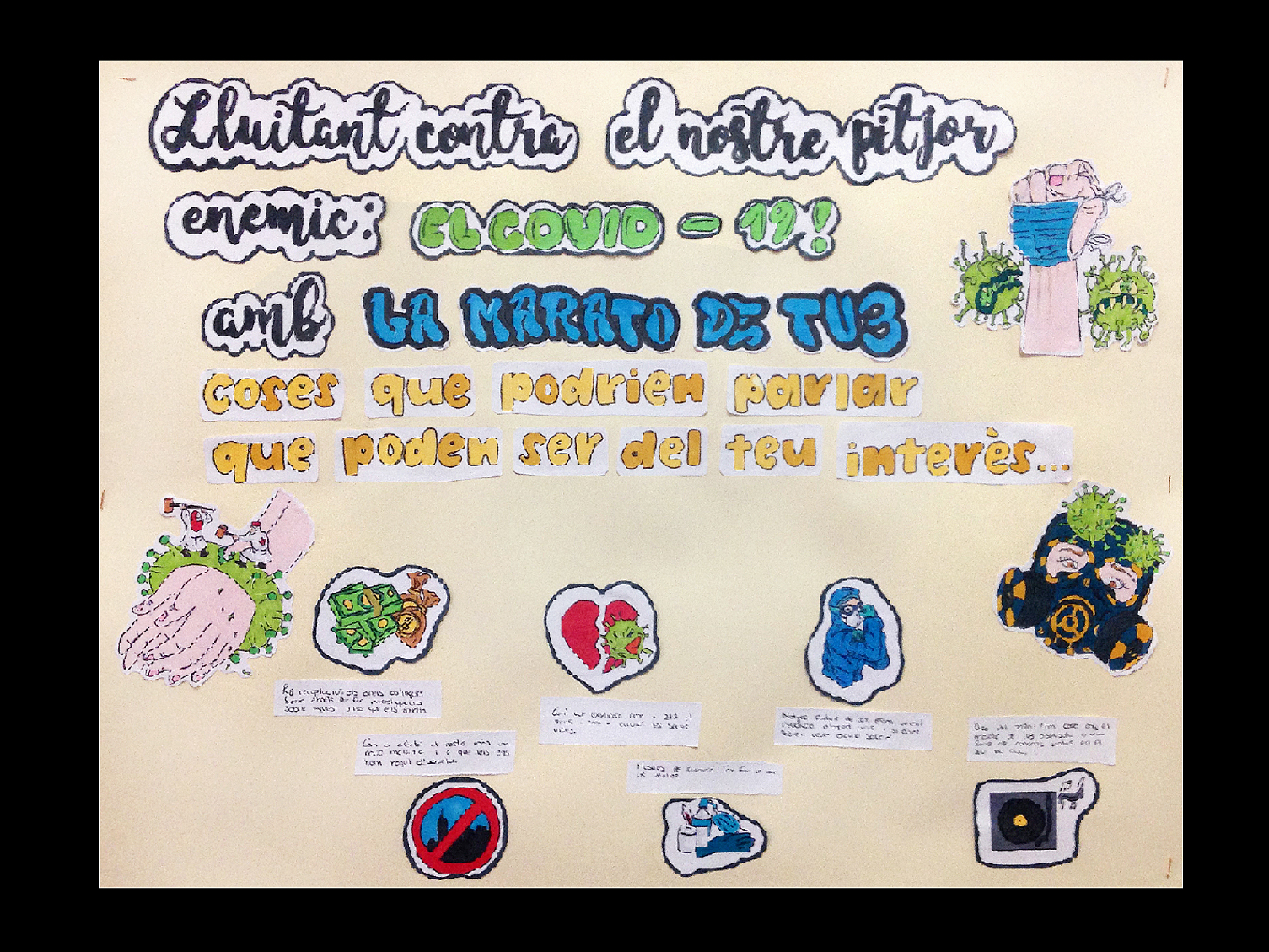 La presa de consciència, la responsabilitat que comporta i les conclusions a les quals s’ha arribat s’han fet extensives a tot l’alumnat del centre educatiu mitjançant l’exposició d’uns murals que han estat realitzats en petits grups seguint el protocol Covid elaborat a l’Institut.