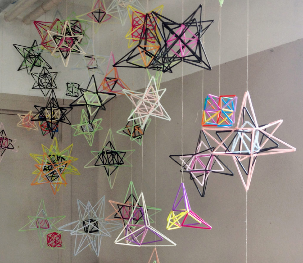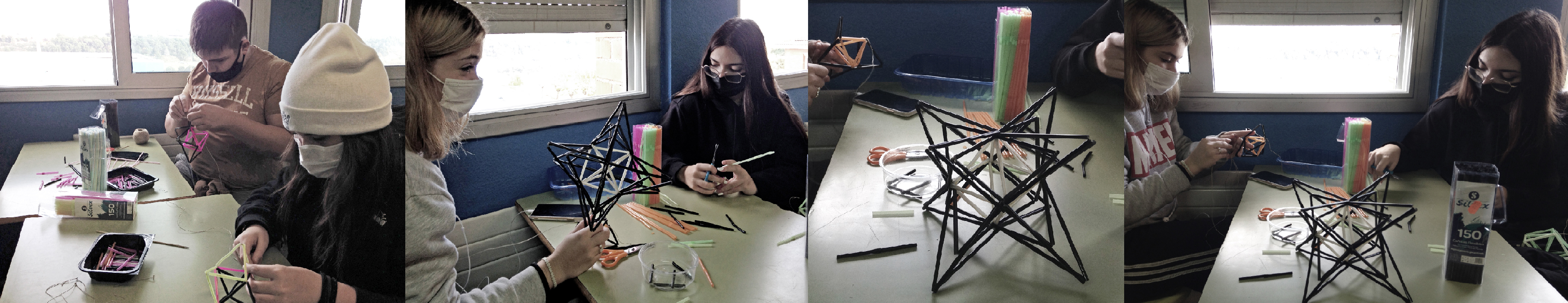 Si bé al primer trimestre, els alumnes de 4t d’ESO implicats amb el projecte Gaudir les formes, varen explorar i aprendre la creació de polígons estrellats i hiperbòlics (entre altres activitats), en el segon trimestre s’ha aprofundit i fet un pas més en construir-los en tres dimensions. Inspirats en els poliedres i les macles realitzades per Gaudí, especialment a les torres de la Sagrada Família, s’ha investigat treballant en els sòlids platònics, els quals s’han estrellat de dues formes diferents generant-se piràmides equilàteres i altres, piràmides de proporció àuria amb relació al poliedre base.