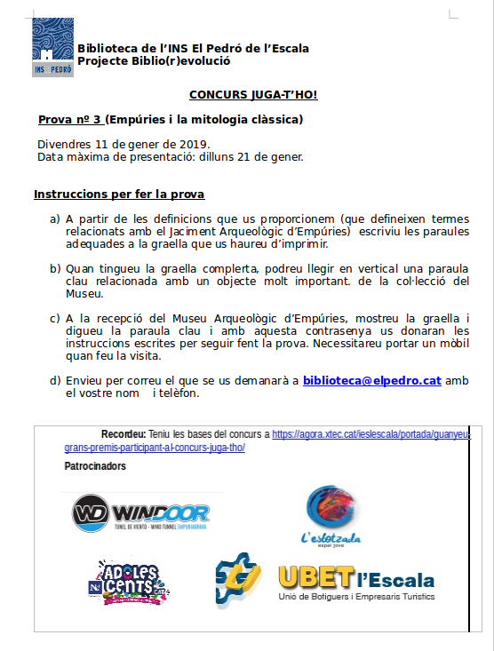 Tothom preparat? Aquí teniu les instruccions per fer la 3a prova del concurs JUGA-T’HO!, convocat per l’equip de Biblio(r)evolució de la nostra biblioteca. Teniu temps des d’avui i fins dilluns 21 de gener per resoldre un enigma i anar a Empúries a fer una segona part de la prova.