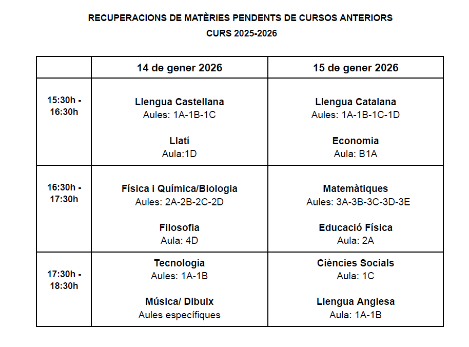 Calendari recuperacions de matèries pendents d’altres cursosPer malbert / 12/01/2026 / General Portada Benvolgudes famílies, Us compartim el calendari de recuperació de matèries pendents d’altres cursos. Per a qualsevol dubte podeu adreçar-vos al centre. Cordialment,