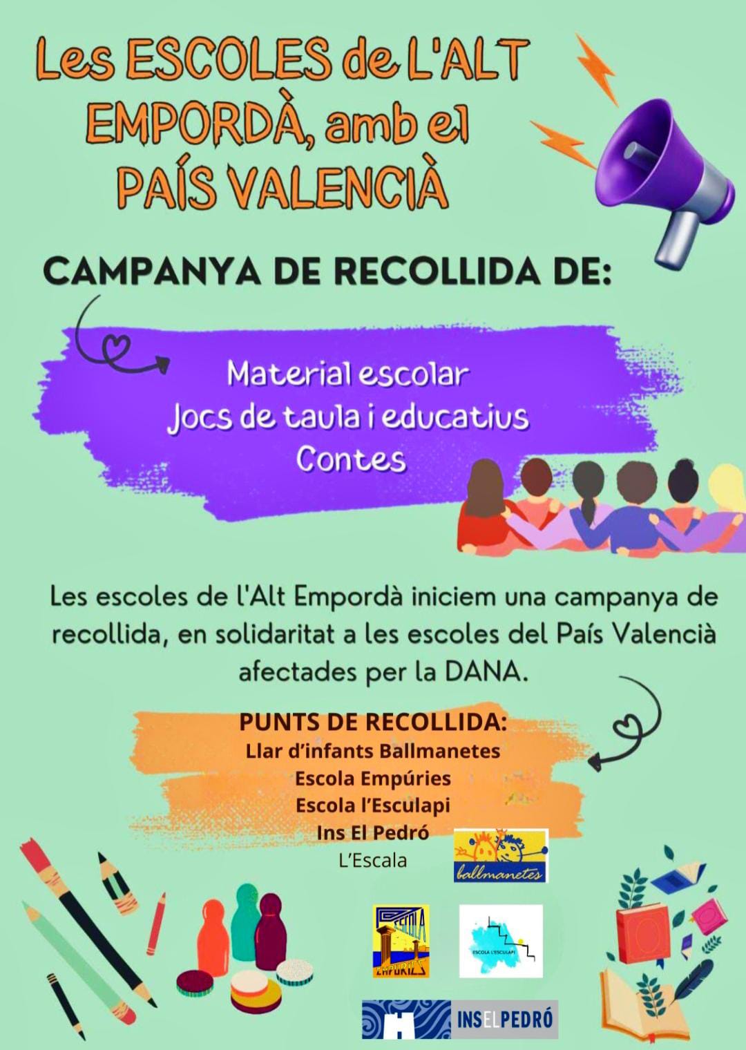 Des de l’institut ens sumem a la campanya de recollida de material escolar (llibretes, llibres de lectura, bolígrafs,….) que portarem a terme tota la comunitat educativa de l’Escala.  Aquesta és una iniciativa de tots els centres educatius de l’Alt Empordà que lidera l’escola de Vilamalla.