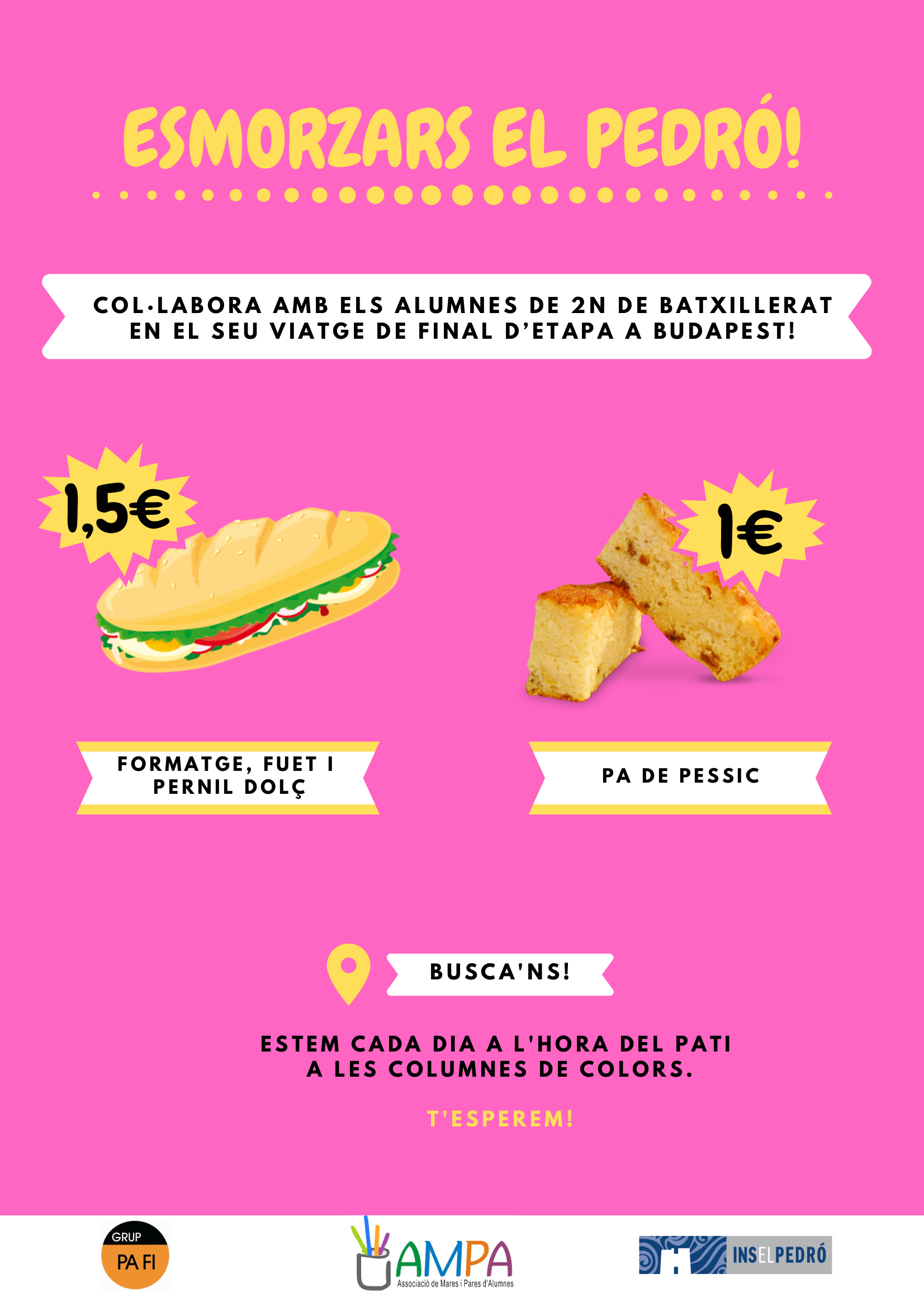 A partir d’avui, l’INS El Pedró, oferirà un servei d’esmorzar a l’hora del pati. Els alumnes de 2n de Batxillerat, amb el suport de l’AMPA, han organitzat un espai per poder vendre, cada dia, entrepans i coques. Aquesta activitat és una iniciativa per poder oferir una alternativa al servei de “cantina” i també per costejar el seu viatge de final d’etapa.
