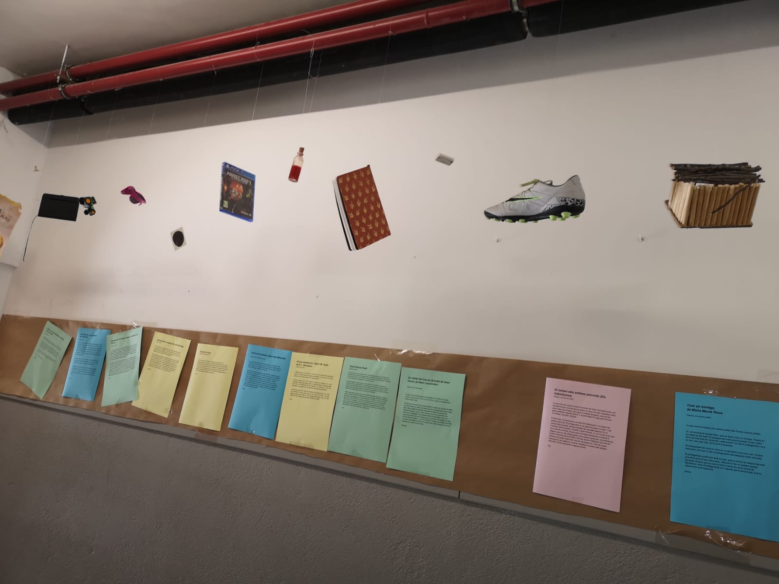 Els alumnes de 1r d’ESO han participat, durant el mes de gener, en una activitat consistent a relacionar un objecte amb una història que estiguin llegint durant l’hora del pla lector. Per això aquests dies el passadís de 1r és ple de coses que els lectors han penjat del sostre i de recomanacions de llibres per als seus companys i els professors.