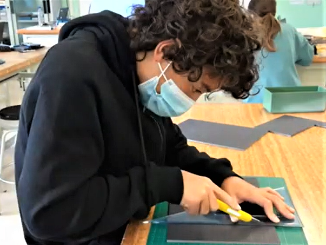 Els alumnes de 1r d’ESO hem dissenyat i construït un tangram. L’hem fet amb cartró ploma i cartró reciclat amb molt de cura ja que hem utilitzat eines de la família de tallar. Aquest tangram ens servirà per estudiar les figures geomètriques a matemàtiques.