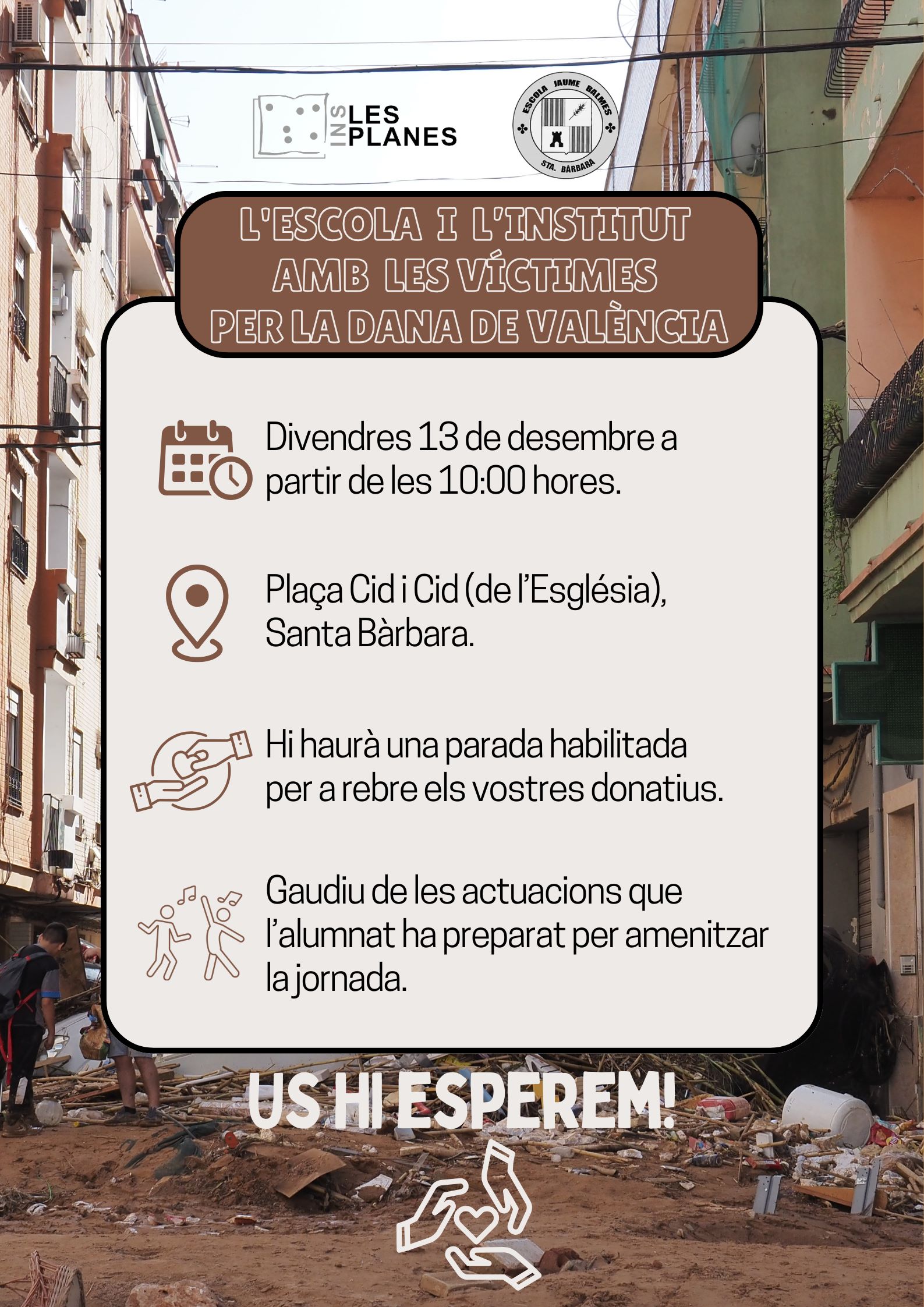 TOTS AMB LES VÍCTIMES DE LA DANA!Per admin / 11/12/2024 / General Portada Aquest divendres 13 de desembre a partir de les 10h l’escola i l’institut amb les víctimes per la Dana de València Aquí us deixem alguns dels moments viscut aquest matí.