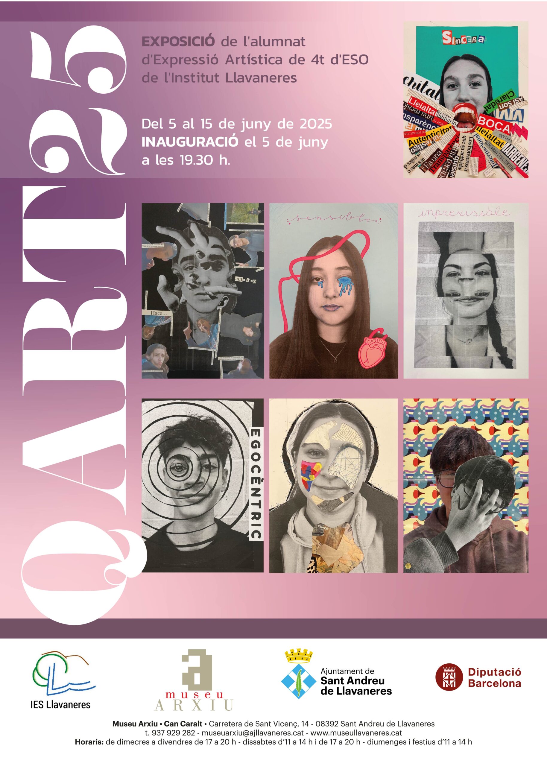 Com ja és habitual, els alumnes de 4t d’ESO que cursen la matèria d’Expressió artística de l’Institut Llavaneres exposen les seves obres a la sala d’exposicions temporals del Museu de Llavaneres. Agraïm un any més l’oportunitat de participar en aquesta activitat.