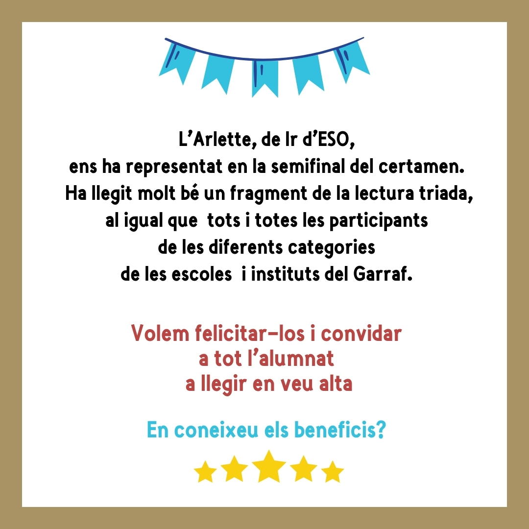 Per tal de posar en valor la pràctica lectora, l’experiència d’escoltar-nos i de llegir generosament pels altres, us deixem alguns beneficis de la lectura en veu alta: millora la comprensió lectora, desenvolupa habilitats orals i de presentació, fomenta la creativitat i la improvisació, millora l’escolta activa, potència la connexió emocional, fomenta la lectura independent, promociona la empatía i la consciència social, millora l’autoestima i l’auto expressió i permet reconèixer la pròpia veu.