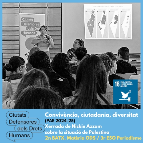 El passat divendres dia 4, els alumnes de 2n de Batxillerat i els de 3r d’ESO de periodisme van poder escoltar a la Nickie Azzam, membre de la Comunitat Palestina a Catalunya i activista en la Defensa dels Drets Humans de la població palestina. Nascuda a Dinamarca, és la tercera generació de refugiats palestins (Nakba). En una xerrada en anglès amb traducció simultània, ens va explicar de primera mà les arrels del conflicte fins a la situació actual amb els terribles efectes de la guerra. Quan la guerra no són només xifres sinó persones que pateixen i vides que es perden, quelcom ens colpeja en lo més profund de la nostra humanitat. L’alumnat, impactat, va participar en el torn obert de preguntes i va poder prendre consciència de la gravetat del conflicte.