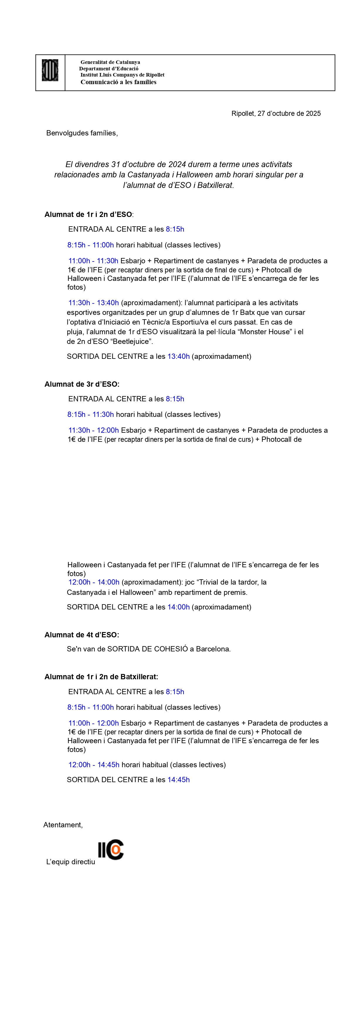 27/10/25Benvolgudes famílies,