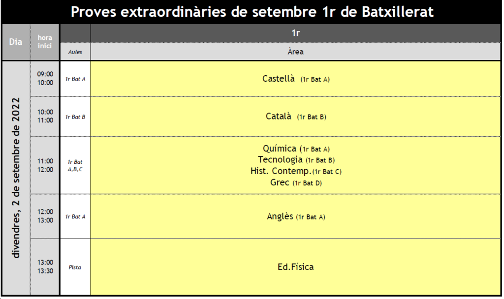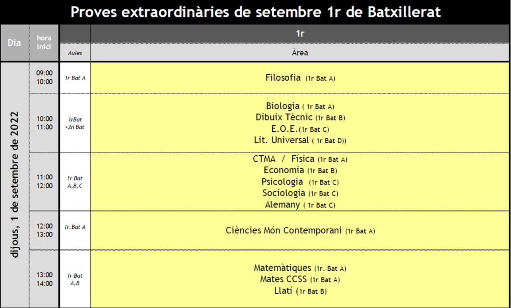 Calendari de proves extraordinàries de recuperació de 1r de Batxillerat (setembre 2022) jaume.carles06/07/22