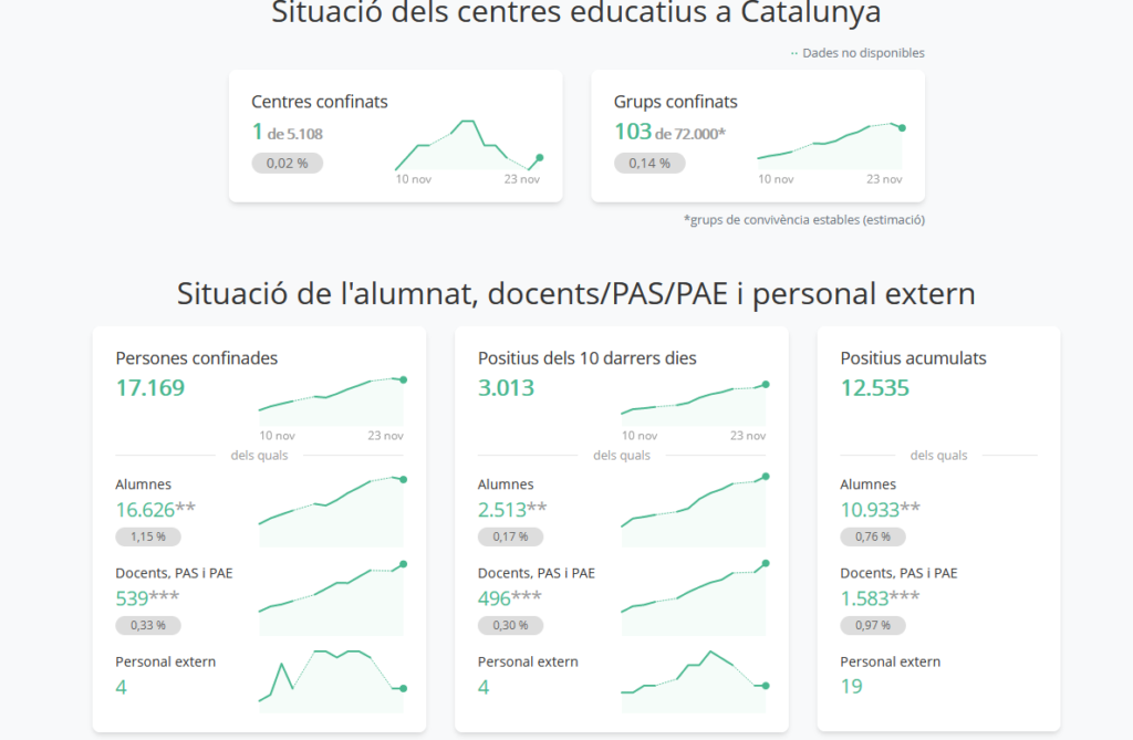Els contagis per COVID19 en general, i als centres educatius en particular, estan augmentant. La imatge següent ens fa reflexionar i mostra l’acusada tendència de creixement del nombre de casos detectats, tant entre l’alumnat com entre el professorat i el PAS, per la qual cosa fem una crida a la prudència, l’ús de la mascareta, neteja de mans, distància social i, si s’escau, a la vacunació.