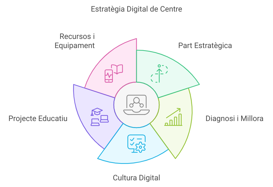 L’Estratègia Digital de Centre (EDC) és un document que, tenint com a referència el Pla d’Educació Digital de Catalunya, recull totes les accions que es realitzen en un centre i les que es realitzaran a mitjà termini, per aconseguir la màxima competència digital de l’alumnat, del professorat i del centre educatiu. Serà la referència del centre en l’àmbit de tecnologies digitals: gestió diària de l’organització digital del centre, actuacions del centre en temes digitals en funcionament o en projecte de desenvolupament, plans, procediments, normatives, protocols, etc.