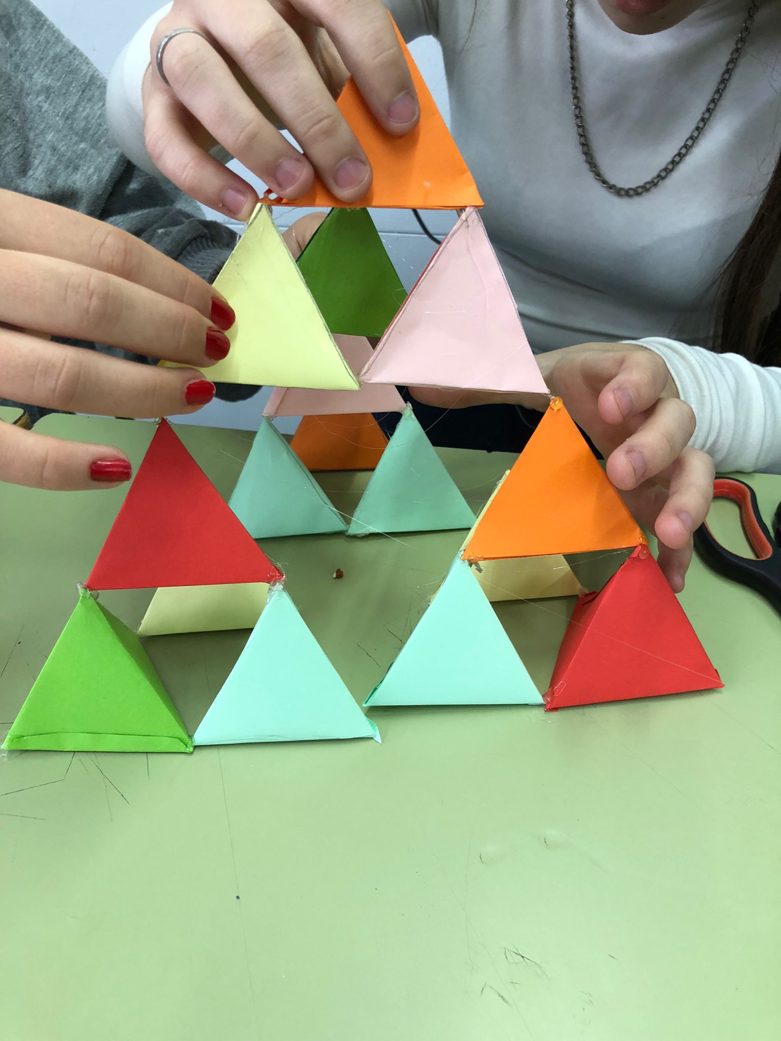 Hem començat construint una piràmide amb 4 tetraedres. Amb 4 piràmides com aquestes hem construït el següent nivell que representa 4 elevat a 2, és a dir 16 tetraedres. Pel següent nivell, hem necessitat 4 elevat a 3, 64 tetraedres. I per l’estructura final 4 elevat a 4, és a dir 256 tetraedres!! Us atreviu a seguir amb el 4 elevat a 5??😱😜